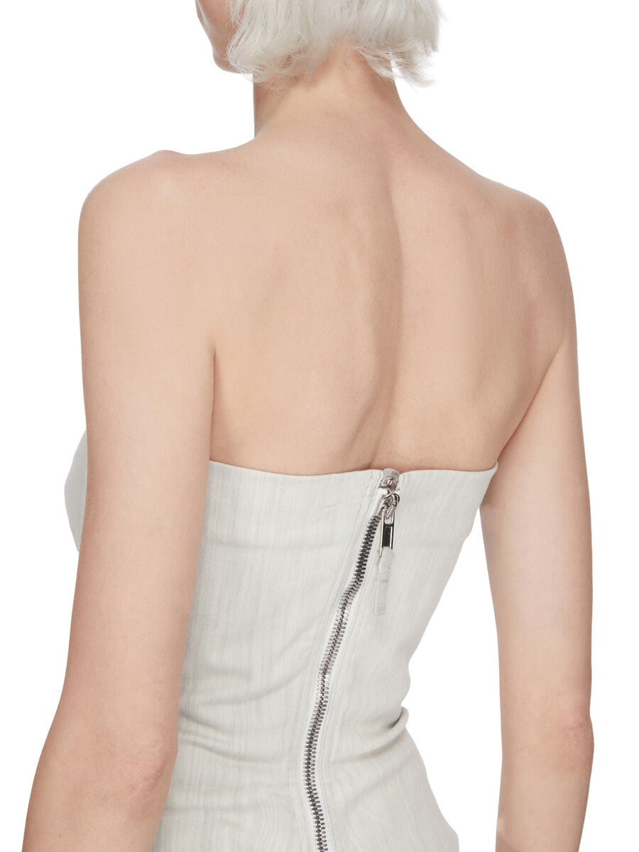 THIS BUSTIER TOP IS ABOVE-HIP LENGTH WITH A CLOSE TO THE BODY FIT. ITS STRAPLESS BUSTIER TOP HAS A SIGNATURE SPLINTERED MOTIVO, WITH SEAM LINES DESCENDING FROM THE NECKLINE TO A BLUNT POINT BELOW THE BUST ACROSS THE CHEST. THEY THEN SLOPE DOWN THE SIDE BODY, WRAPPING TO THE HEM. IT HAS A CENTRE BACK ZIPPER AND RAW CUT HEM.