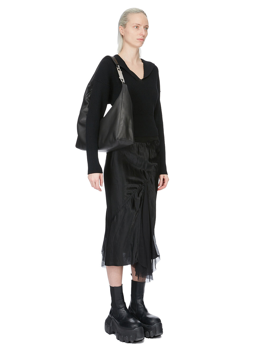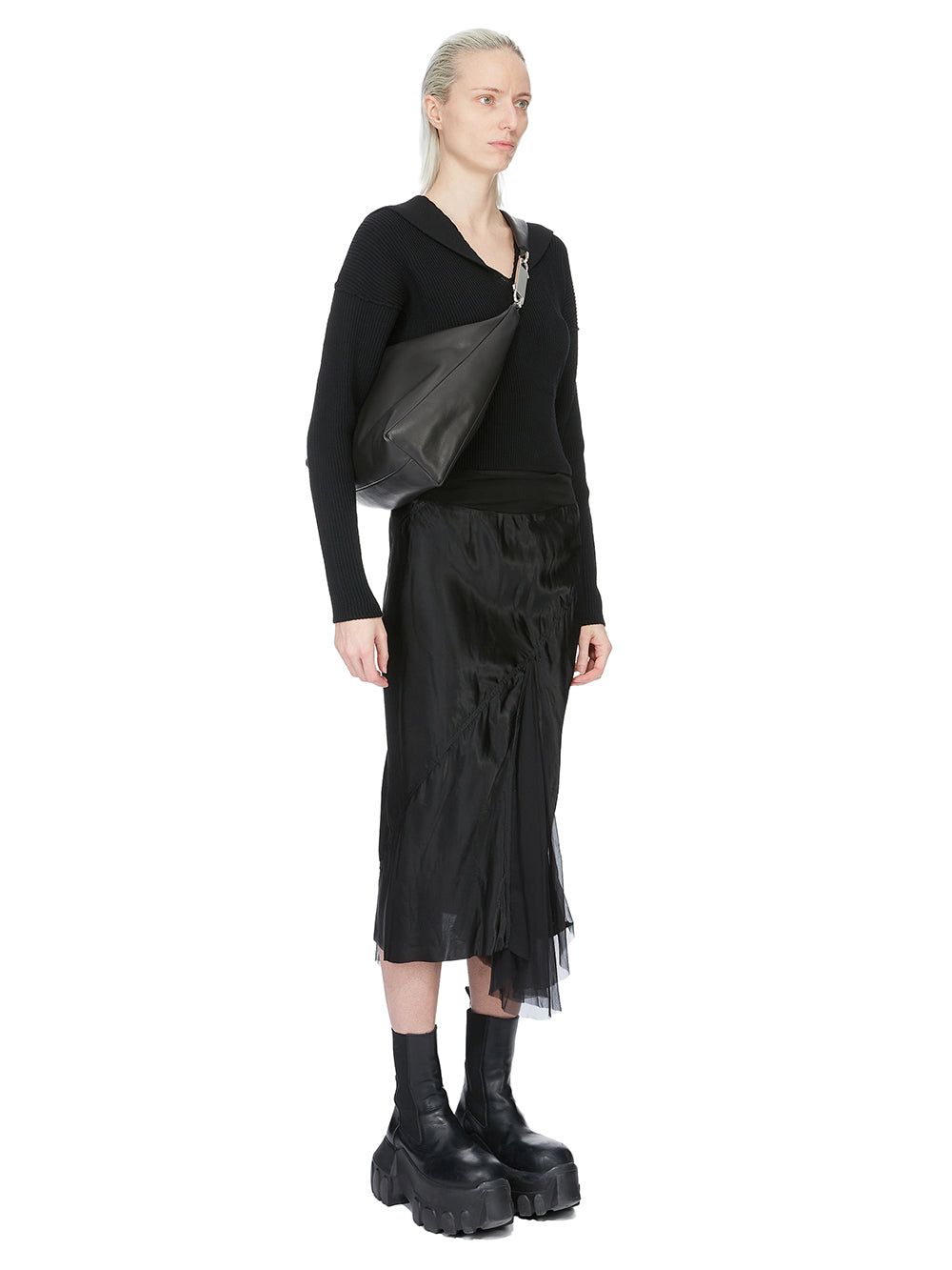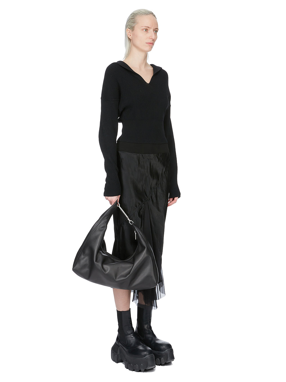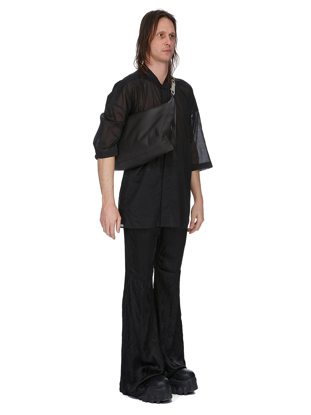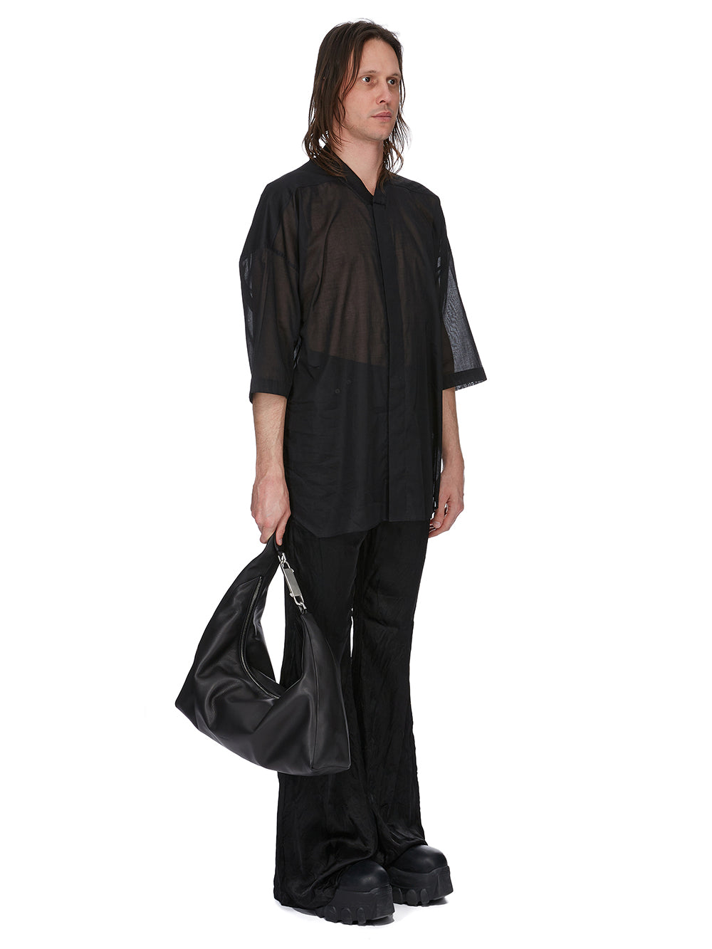 THIS CROPPED GEMINI BAG IS A SMALL, CROPPED SOFT BAG THAT SLOUCHES IN THE MIDDLE. IT CURVES OVER TO CREATE A STRAP THAT SECURES WITH A GEMINI DOUBLE-ENDED SNAP HOOK, ENGRAVED WITH THE RICK OWENS LOGO. THE BAG OPENS WITH A TOP ZIPPER, HAS ONE MAIN POUCH AND AN INNER, ZIPPERED, HANGING POCKET. IT IS EMBOSSED WITH THE RICK OWENS LOGO ON FRONT.