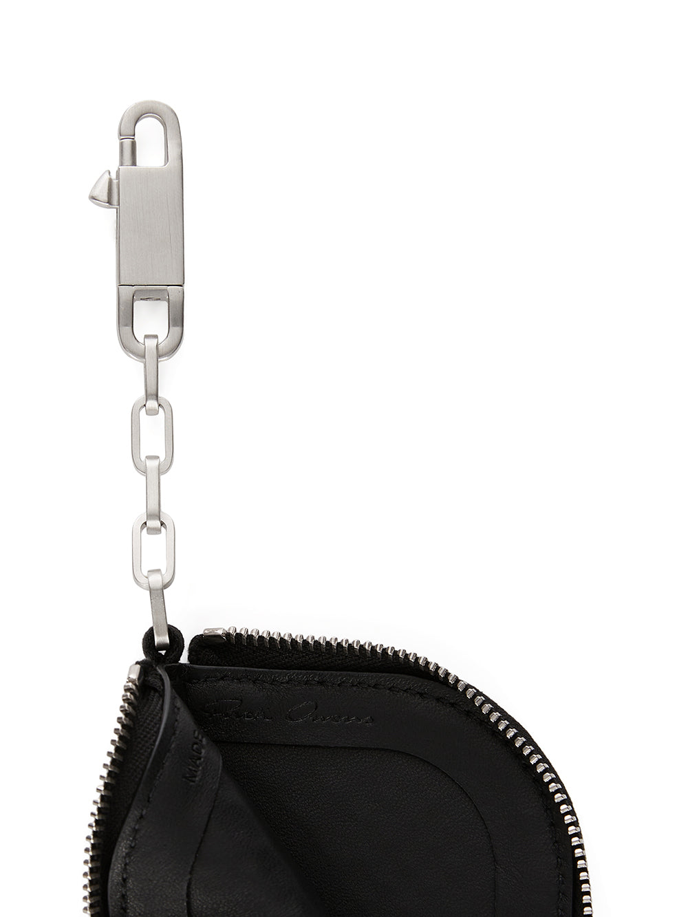 THIS HOOK WALLET IS RECTANGULAR IN SHAPE WITH ONE ROUNDED CORNER AND A ZIPPER CLOSURE. IT HAS A CHAIN WITH A SMALL PALLADIUM TONE BRASS HOOK.