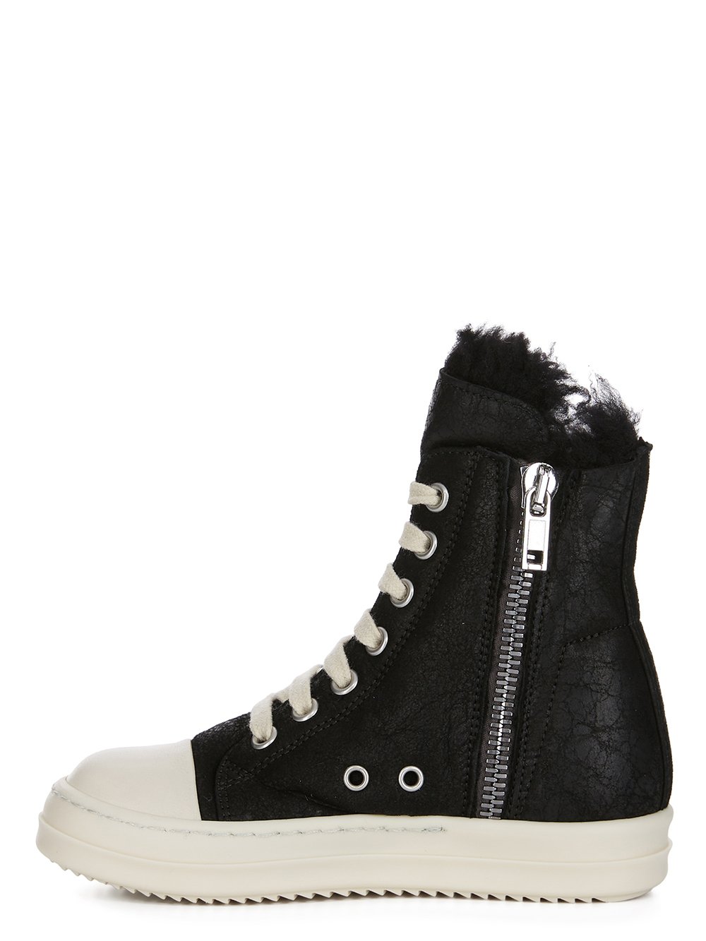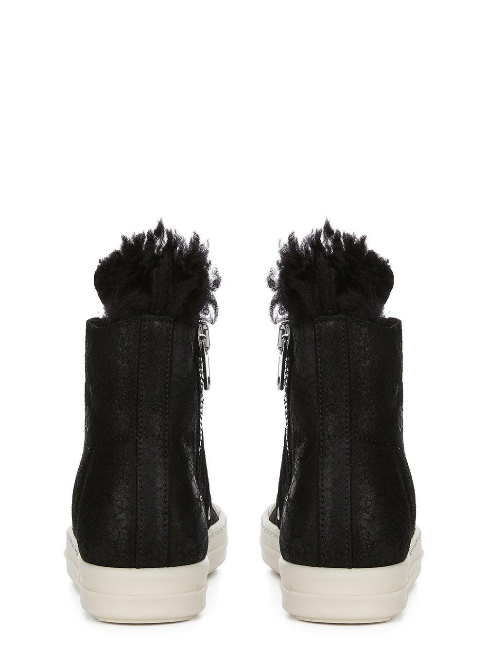 RICK OWENS FW25 CONCORDIANS SHEARLING SNEAKS IN BLACK/MILK/MILK CURLY SHEARLING