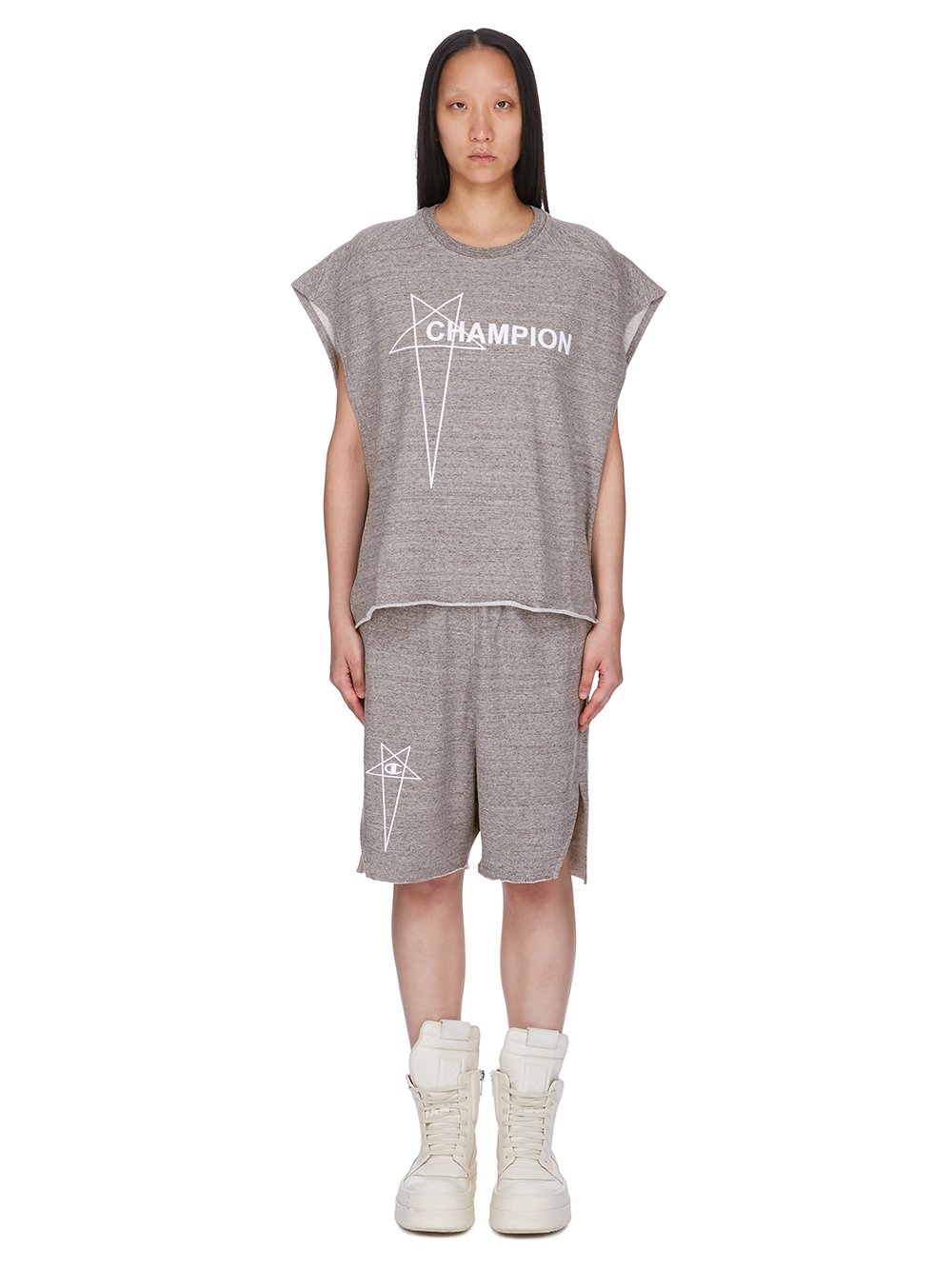 CHAMPION X RICK OWENS SS25 BEVELED PODS IN GREY MELANGE MELANGE FELPA JERSEY