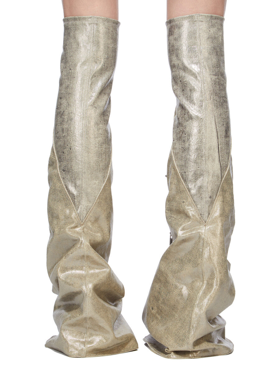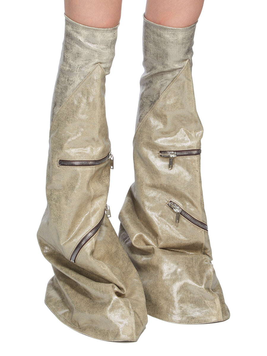 THESE CARGO FETISH BOOTS ARE ABOVE-KNEE HIGH WITH A STRETCH LEATHER TOP. THEY HAVE A BOOT SHAPED UPPER WITH AN ADDITIONAL LAYER FALLING FROM AN ASYMMETRICAL SEAM LINE, GRAZING THE FLOOR. THEY FEATURE TWO FRONT ZIPPERS, ONE HORIZONTAL AND ONE ANGLED. THEY HAVE MILK TOE CAPS AND SHARK TOOTH SOLES.
