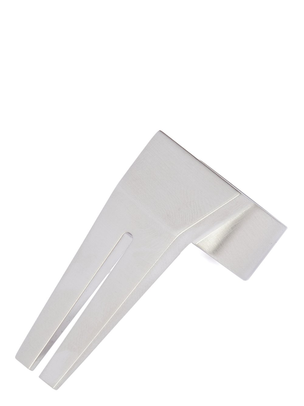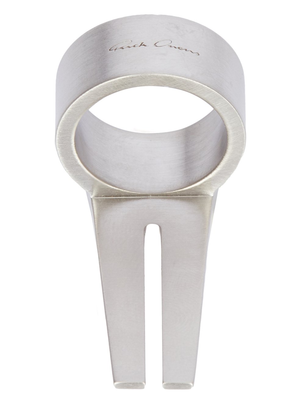THIS OPEN TRUNK RING IS A THICK BAND WHICH EXTENDS INTO A GEOMETRIC TRUNK SHAPE WITH AN OPEN FACE CENTRE SLIT AND BEVELED EDGES AND THE RICK OWENS LOGO ENGRAVED ON THE BACK. THESE JEWELLERY PIECES ARE CRAFTED WITH THE INDIVIDUAL HANDWORK OF THE ARTISAN, MAKING EACH PIECE UNIQUE.