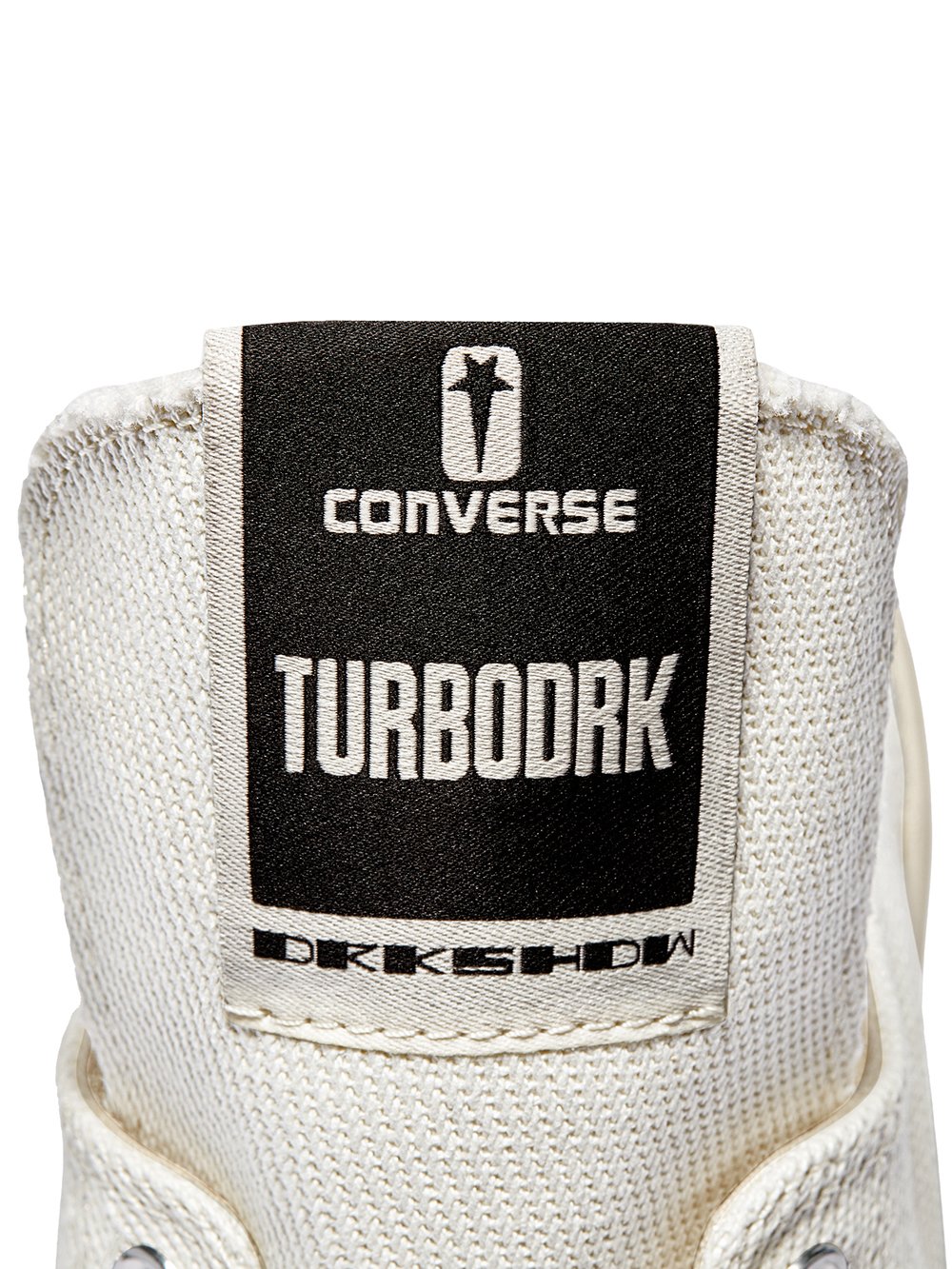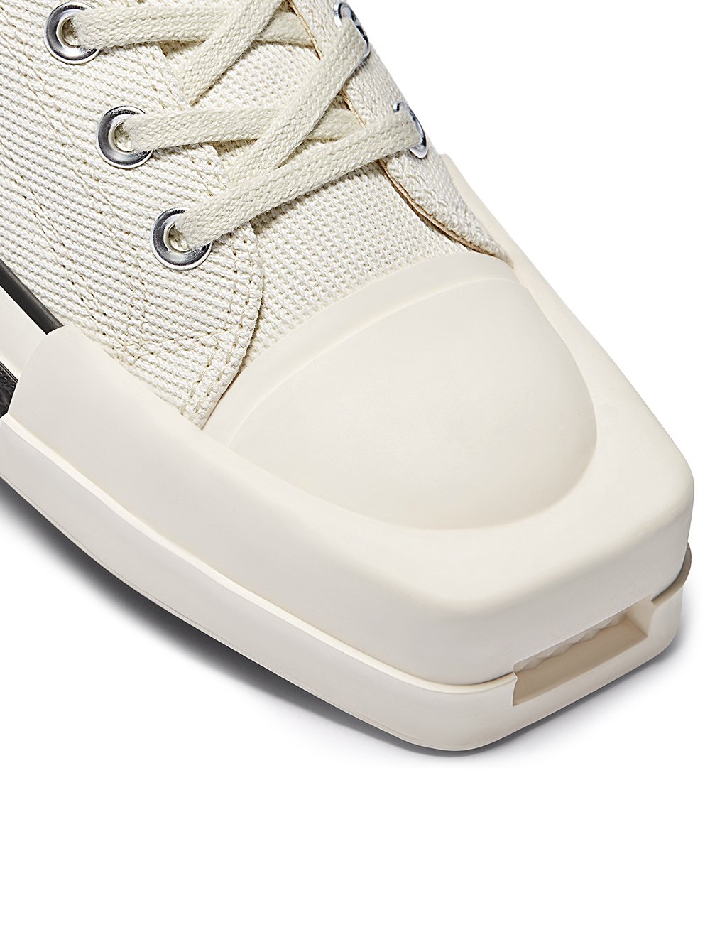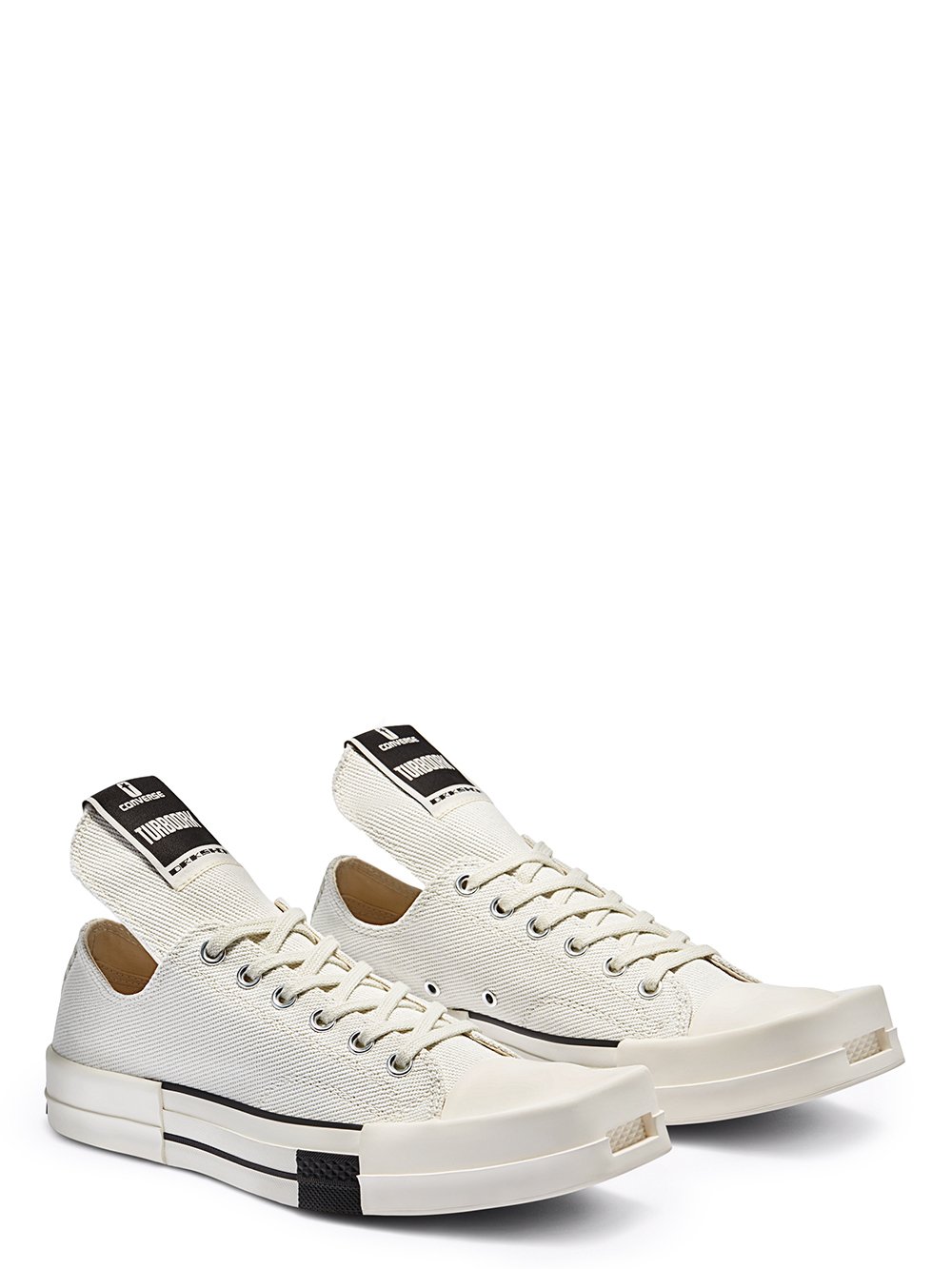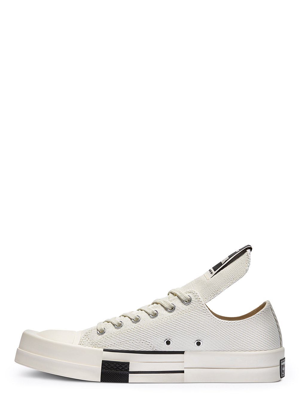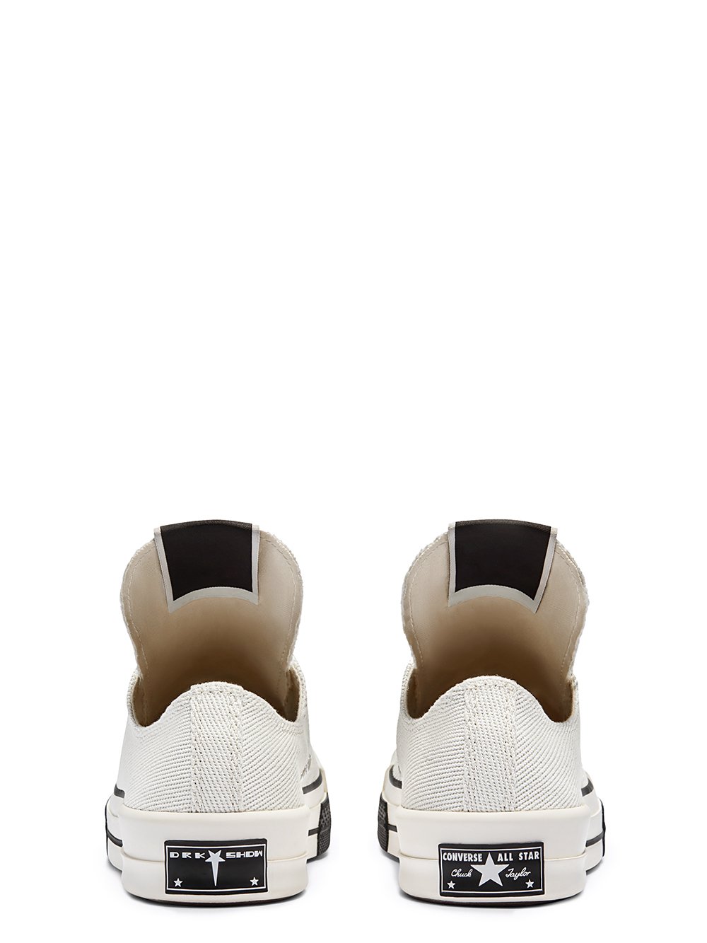 THIS WHITE WAXED COTTON TWILL LACED SHOE IS BASED ON THE CLASSIC CONVERSE 70’S CHUCKS, FEATURES A SIGNATURE DRKSHDW ELONGATED TONGUE WITH A CUSTOM BRANDED WRAP AROUND WOVEN LABEL BEARING THE MODEL NAME. TONAL STITCHING AND LACES. SIGNATURE RICK OWENS MOLDED RUBBER HEEL AND MOLDED RUBBER TOE CAP ARE SUPERIMPOSED ONTO THE CLASSIC 70’S CHUCKS RUBBER SOLE. WHITE UPPER AND WHITE RUBBER SOLE.