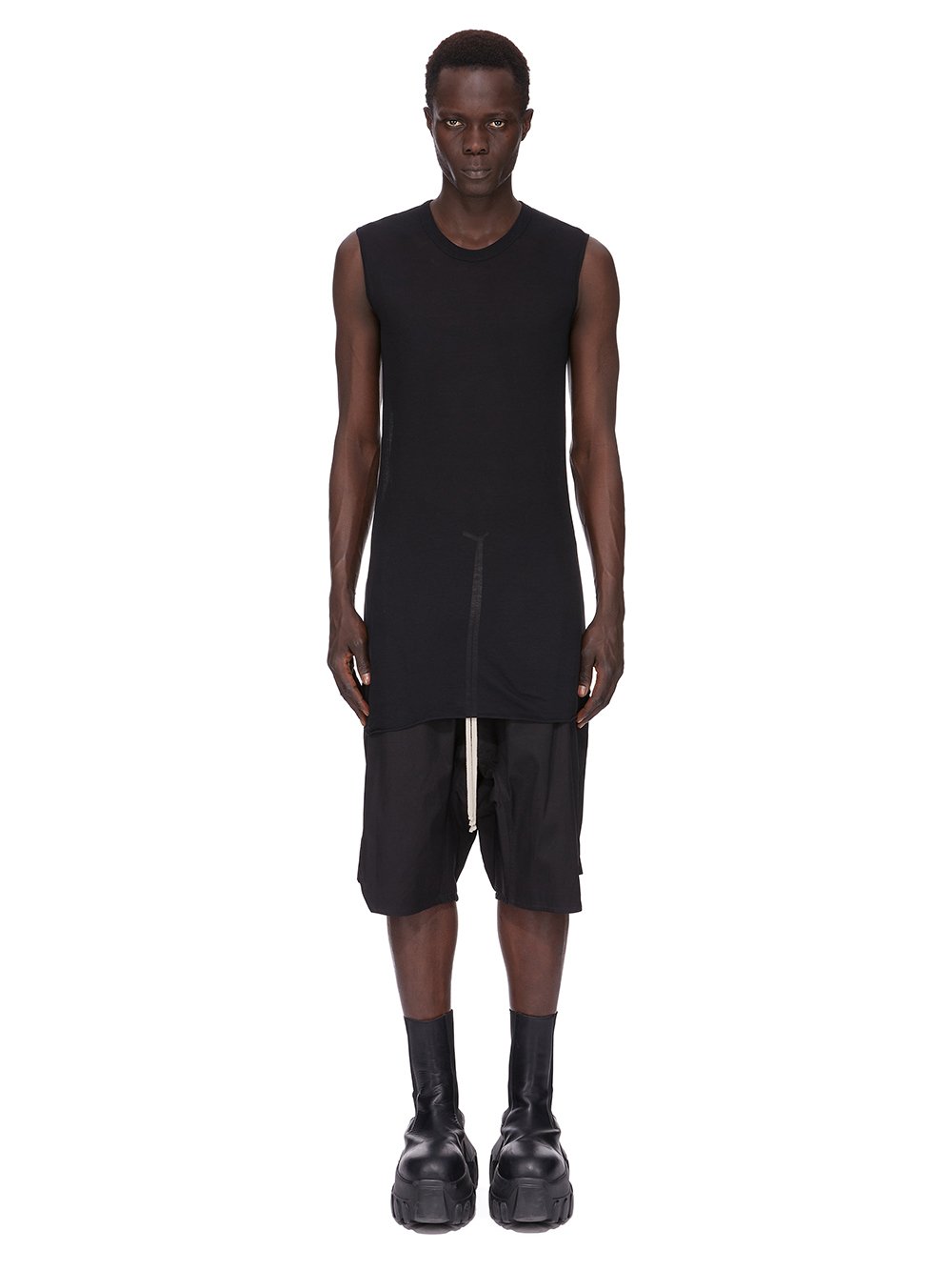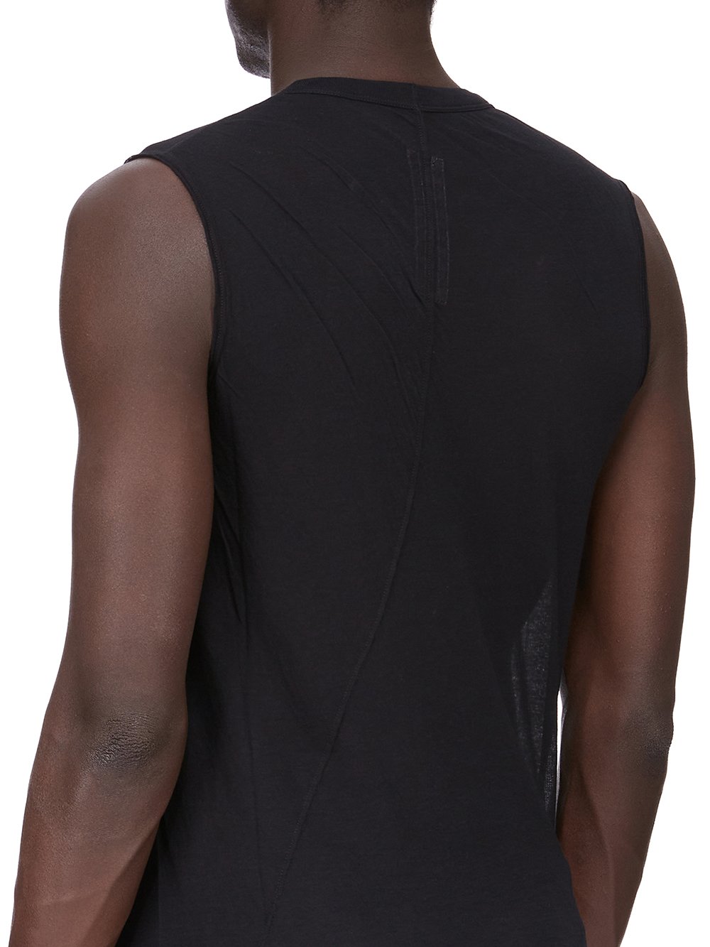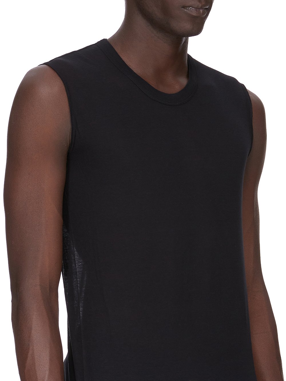 THIS BASIC SL T IS BELOW HIP LENGTH AND SLEEVELESS. IT HAS A RIBBED ROUND NECK, RAW CUT HEM AND REINFORCED RAW SHOULDERS. IT FEATURES THE SIGNATURE SINGLE SEAM RUNNING DOWN THE CENTRE BACK SPINE.