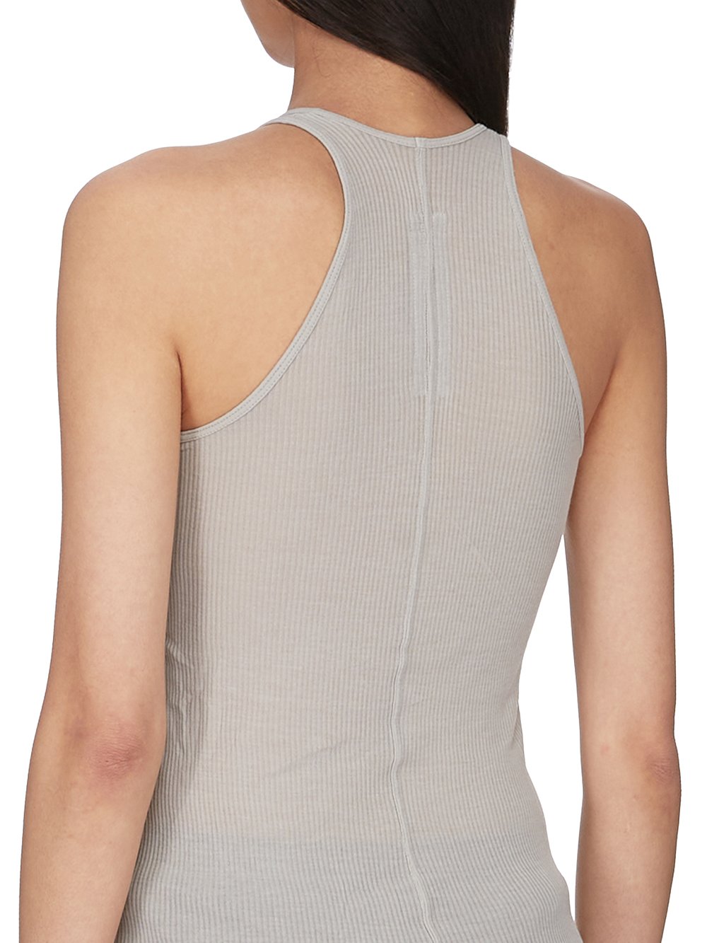 THIS BASIC RIB TANK IS HIP LENGTH WITH A ROUNDED RAW CUT HEM THAT DIPS IN FRONT AND BACK. IT HAS A ROUND NECKLINE AND THIN SHOULDER STRAPS THAT FLOW INTO A SLIGHT RACER BACK. IT FEATURES THE SIGNATURE SINGLE SEAM RUNNING DOWN THE CENTRE BACK SPINE.