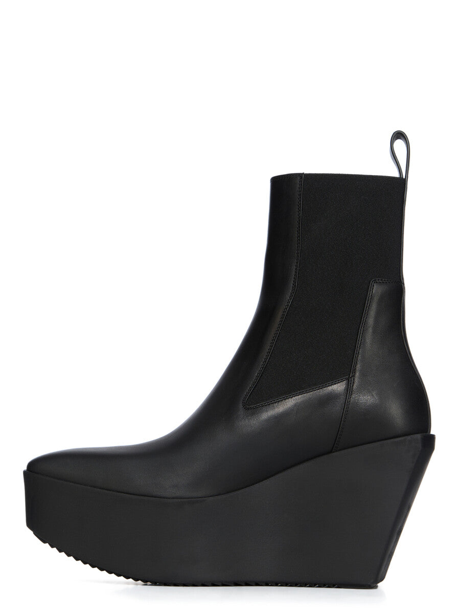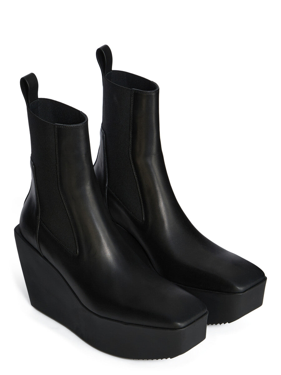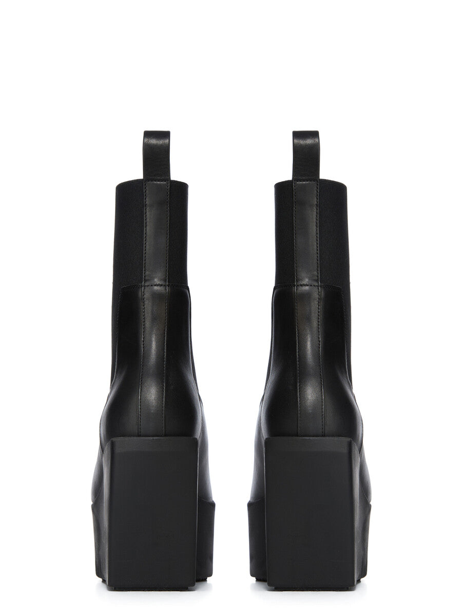 THESE SLIVER PLATFORM BEATLES ARE ABOVE-ANKLE HEIGHT. THEY HAVE THEY HAVE A TOPSTITCHED SEAM ARCING OVER THE FRONT FOOT WITH A FLAT STRAP RUNNING OVER ON ANTERIOR ANKLE, SIDE PANELS IN STRETCH ELASTIC, AN ANGULAR HEEL COUNTER AND A BACK LOOP PULL TAB. THEY FEATURE A SOLE WITH SLANTING HEEL (11CM AT HEEL, 4,5CM AT TOE) AND INCLINE PLATFORM WITH A SQUARE TOE.