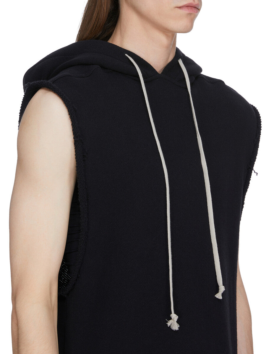THIS SL HOODIE IS HIP LENGTH AND IS SLEEVELESS. IT HAS A BIG DRAWSTRING HOOD AND RAWCUT DEEP ARMHOLES.