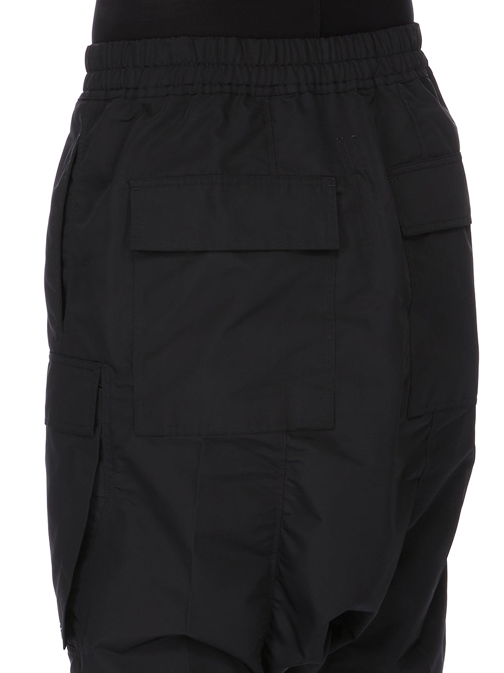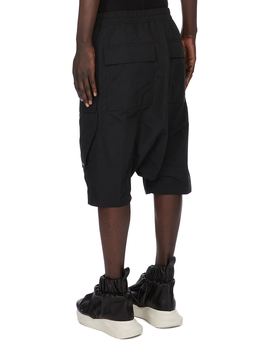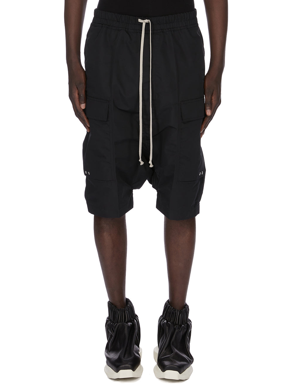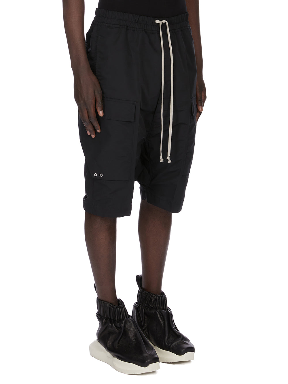 THESE CARGO PODS ARE BELOW-KNEE LENGTH WITH AN EXTREME LOW CROTCH. THEY HAVE AN ELASTICIZED WAISTBAND WITH DRAWSTRING AND SIDE SEAM POCKETS. THEY FEATURE TWO BIG BEVELED CARGO POCKETS ON THE OUTER THIGH WITH FLAPS AND SMALL SILVER EYELET DETAIL, AND TWO SQUARE BACK POCKETS WITH FLAPS.