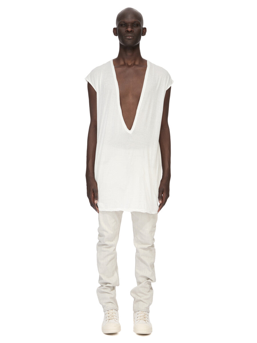 THIS DYLAN T IS BELOW HIP LENGTH, IT HAS AN EXTREME DEEP V NECK WITH WIDE TANK SHOULDERS WITH REINFORCED RAW CUT ARMHOLES. IT FEATURES THE SIGNATURE SINGLE SEAM RUNNING DOWN THE CENTRE BACK SPINE.