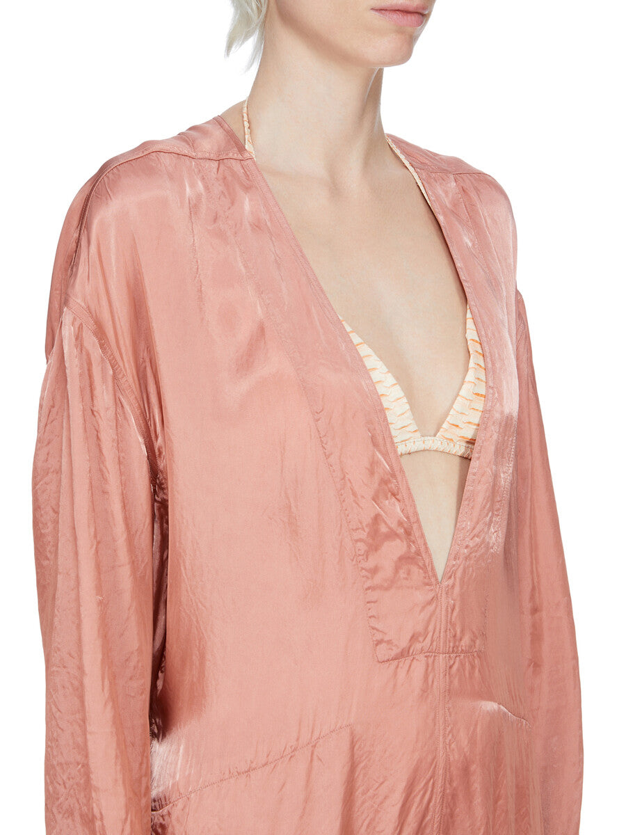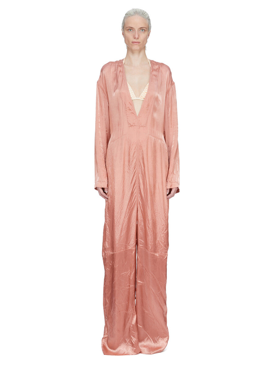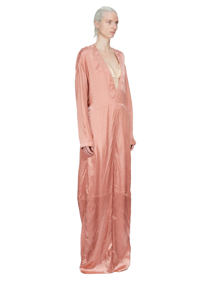 RICK OWENS SS26 TEMPLE LS LONG JUMPSUIT IN CORAL CUPRO SATIN