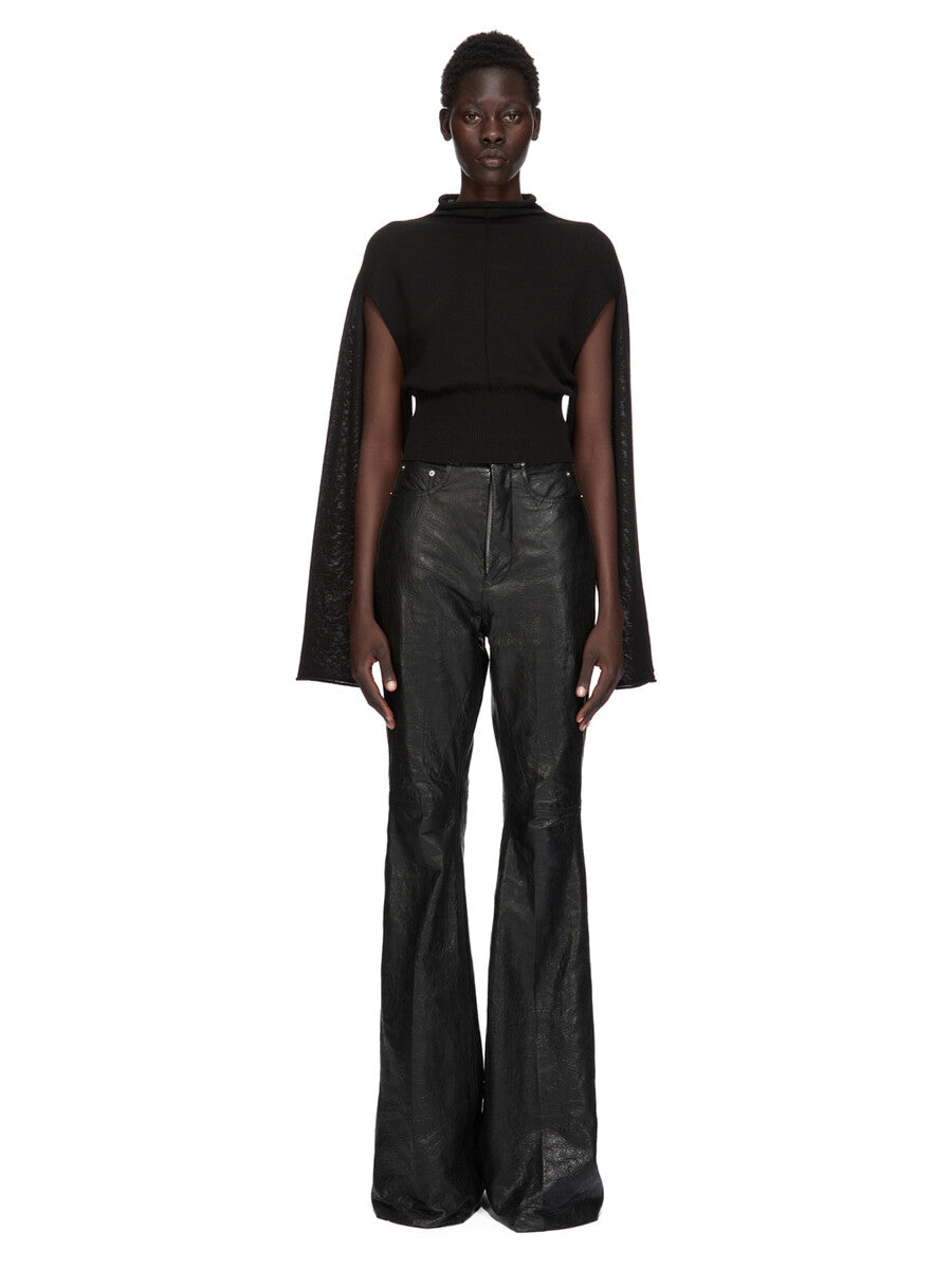 THIS CON CROPPED TOP IS WAIST LENGTH WITH A WIDE RIBBED WAISTBAND. IT HAS LONG, WIDE KIMONO-LIKE, CAPE SLEEVES, SO THE ARMS CAN BE WORN IN OR OUT. IT HAS A HIGH NECK WITH A ROLLED EDGE. IT FEATURES A SIGNATURE KNIT LINE RUNNING DOWN THE CENTRE BACK SPINE.