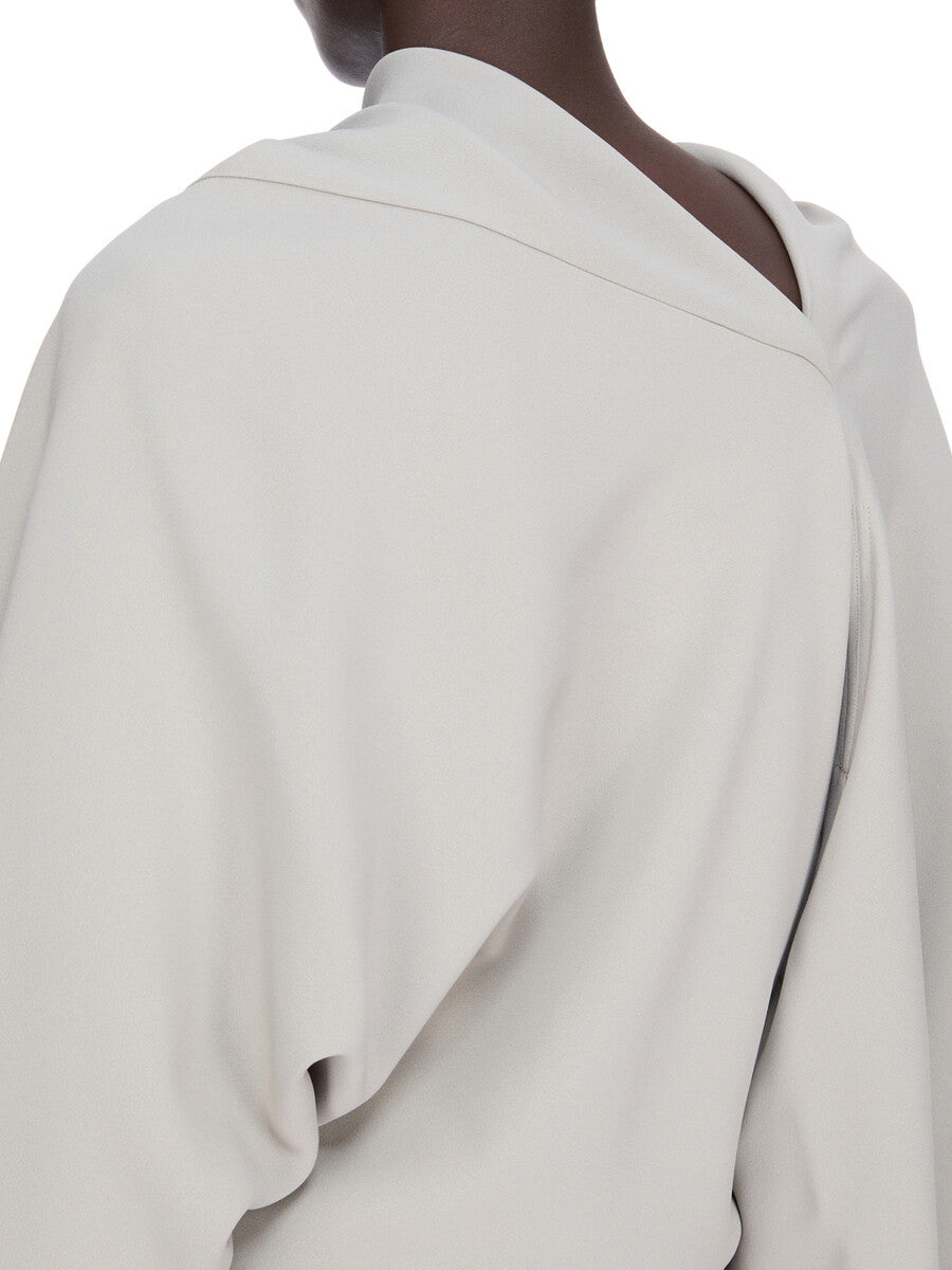 THIS CYLINDER TOP IS HIP-LENGTH, WITH A DRAPED BIAS CUT BODY, ELBOW-LENGTH WIDE SLEEVES AND A HIGH DRAPED COWL NECK THAT HAS AN ASYMMETRICAL OPENING AT BACK. IT GATHERS INTO THE WAIST AND FINISHES IN A TIGHT BODY TO THE HIP.