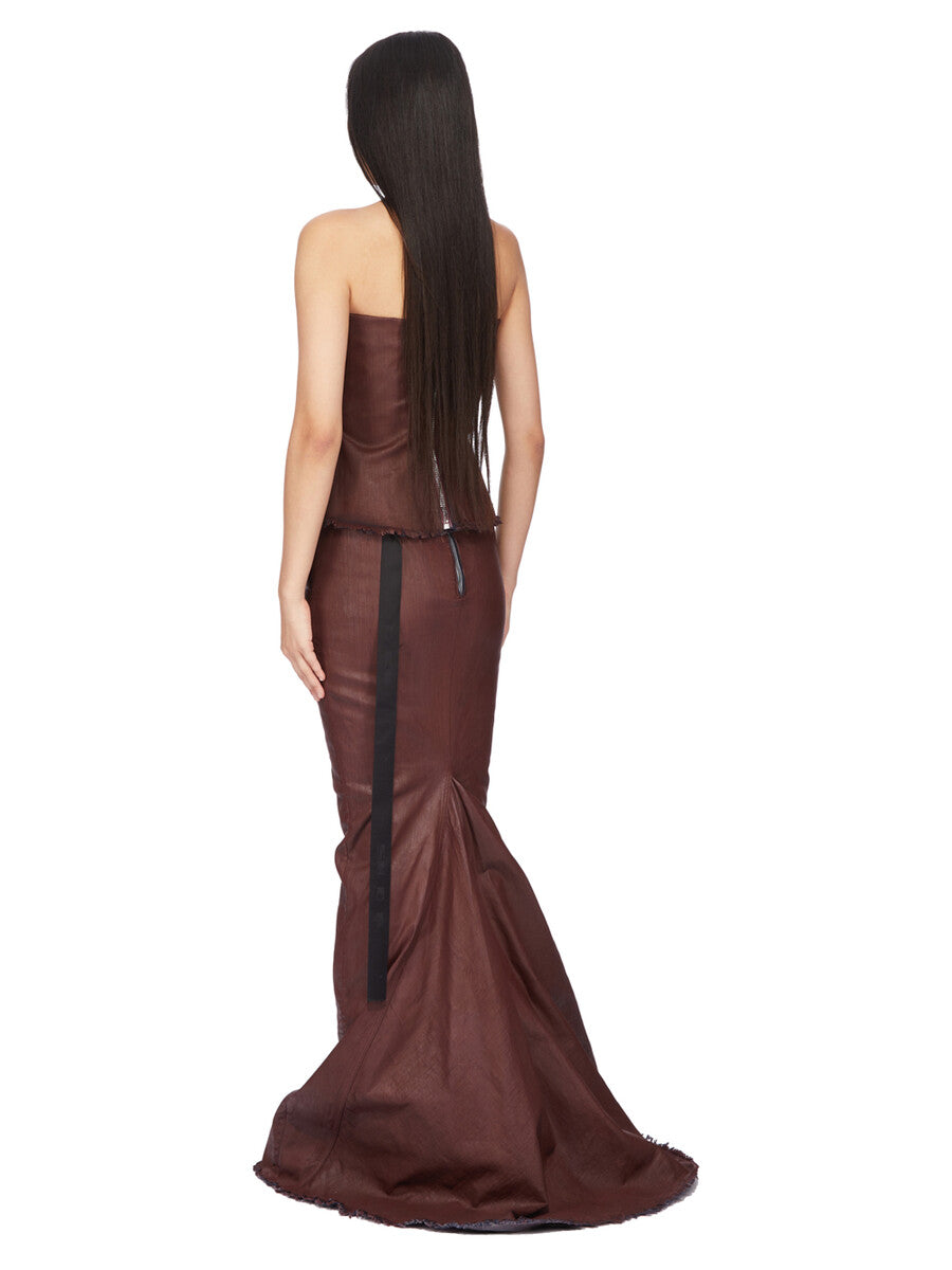 THIS BUSTIER TOP IS ABOVE-HIP LENGTH WITH A CLOSE TO THE BODY FIT. ITS STRAPLESS BUSTIER TOP HAS SEAM LINES ACROSS THE CHEST AND SLOPING DOWN THE SIDE BODY WRAPPING TO THE HEM. IT HAS A CENTRE BACK ZIPPER WITH PULL TAB AND A RAW CUT HEM.