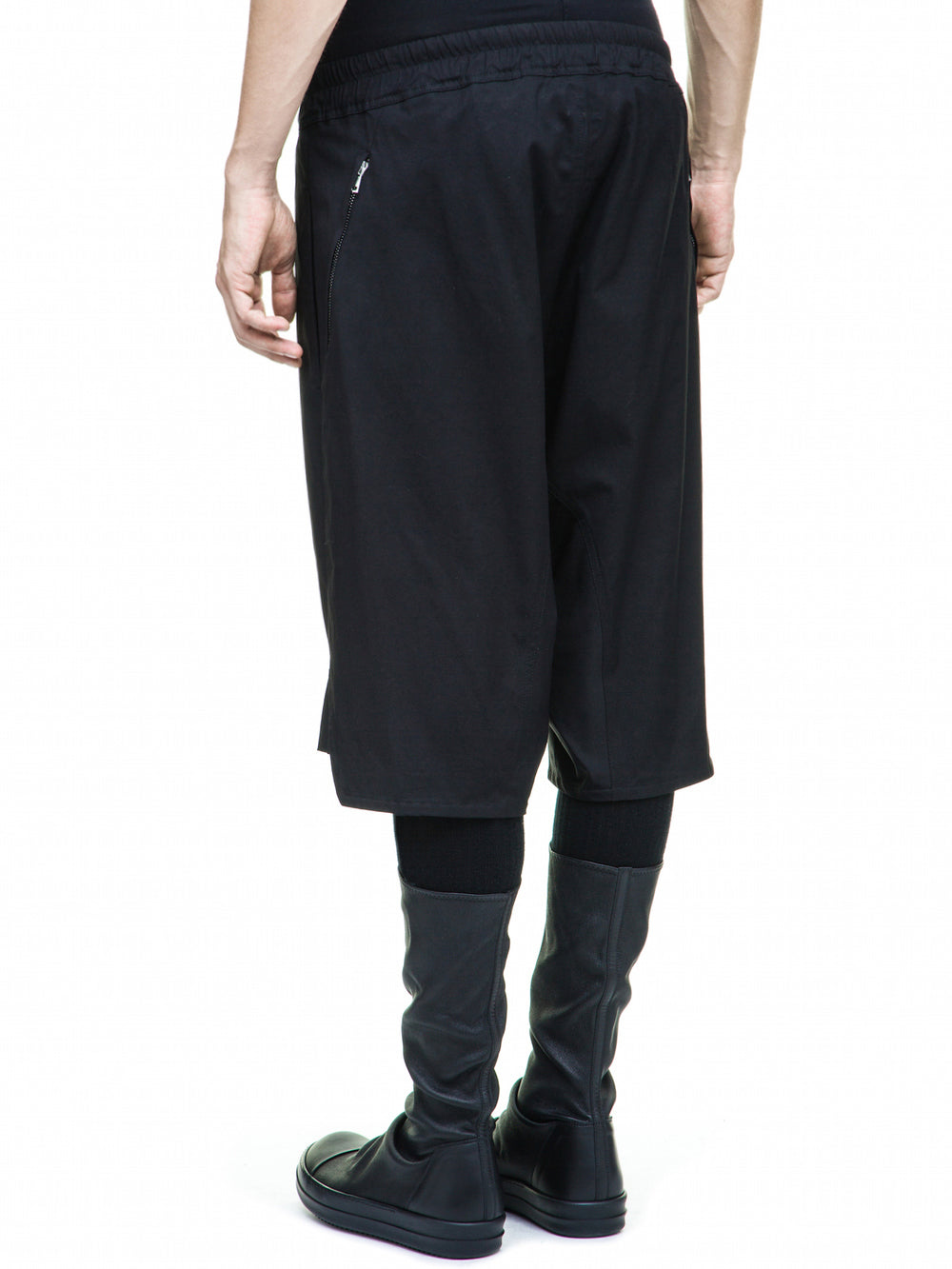 RICK OWENS FOREVER BASKET SWINGER SHORTS IN BLACK HEAVY COTTON POPLIN. THESE BASKET SWINGERS ARE ABOVE THE KNEE LENGTH WITH A DROPPED CROTCH. THEY HAVE AN ELASTICIZED WAISTBAND WITH DRAWSTRING, A CONCEALED FLY, TWO SIDE FRONT POCKETS WITH ZIPPER CLOSURE, AND SIDE SLITS.