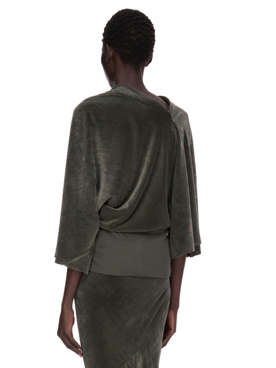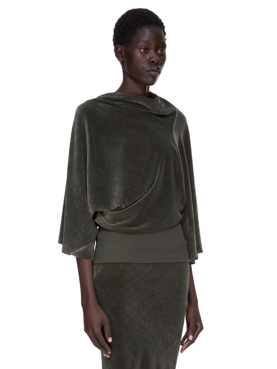 THIS CYLINDER TOP IS HIP-LENGTH, WITH A DRAPED BIAS CUT BODY, ELBOW-LENGTH WIDE SLEEVES AND A HIGH DRAPED COWL NECK THAT HAS AN ASYMMETRICAL OPENING AT BACK. IT GATHERS INTO THE WAIST AND FINISHES IN A TIGHT BODY TO THE HIP.