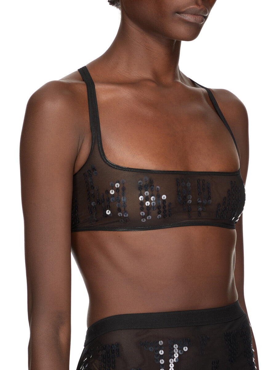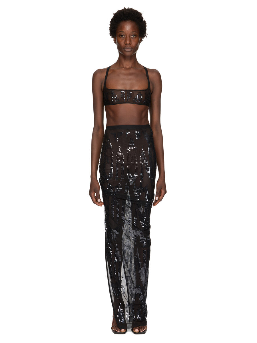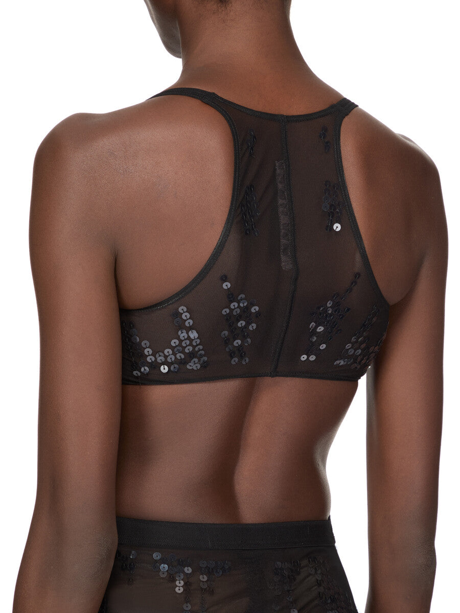 RICK OWENS SS26 TEMPLE UNHORNY TOP IN BLACK/TRANSPARENT BLACK EMBROIDERED STRETCH TULLE