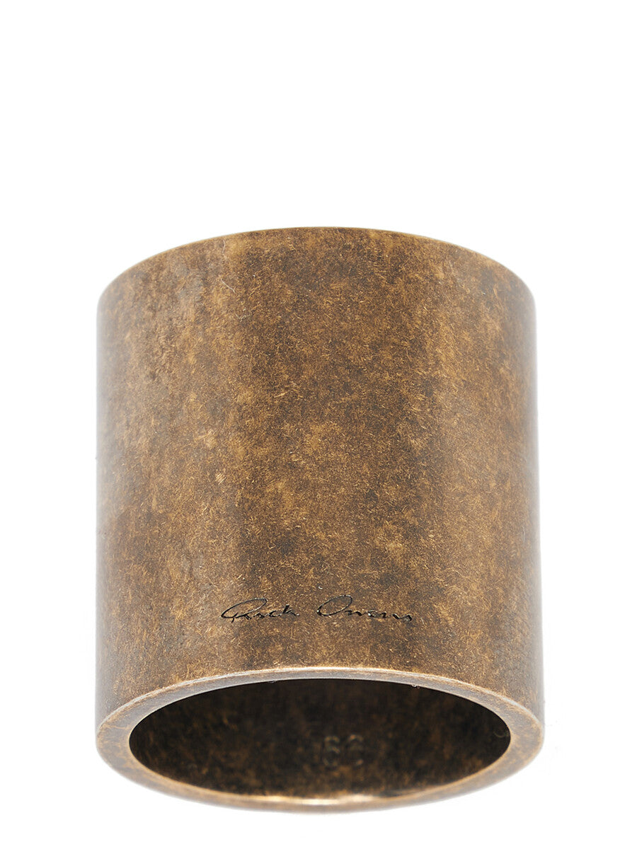 THIS SLITTED THUMB RING IS A WIDE TUBE SHAPED BAND WITH A SLIT NOTCHED FROM THE CENTRE FRONT. IT HAS THE RICK OWENS LOGO ENGRAVED ON THE BACK. THIS IS THE DARK BRONZE VERSION.
