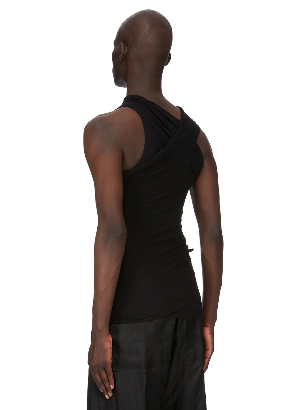 THIS HOLLYWOOD BANANA T IS ABOVE HIP LENGTH AND SLEEVELESS. IT HAS AN UNDER LAYER WITH TWO ROUND HOLES WITH RIB EDGES, AND AN OUTER LAYER THAT FOLDS UP TO CREATE A CRISS CROSS DRAPED NECK FRONT AND BACK.