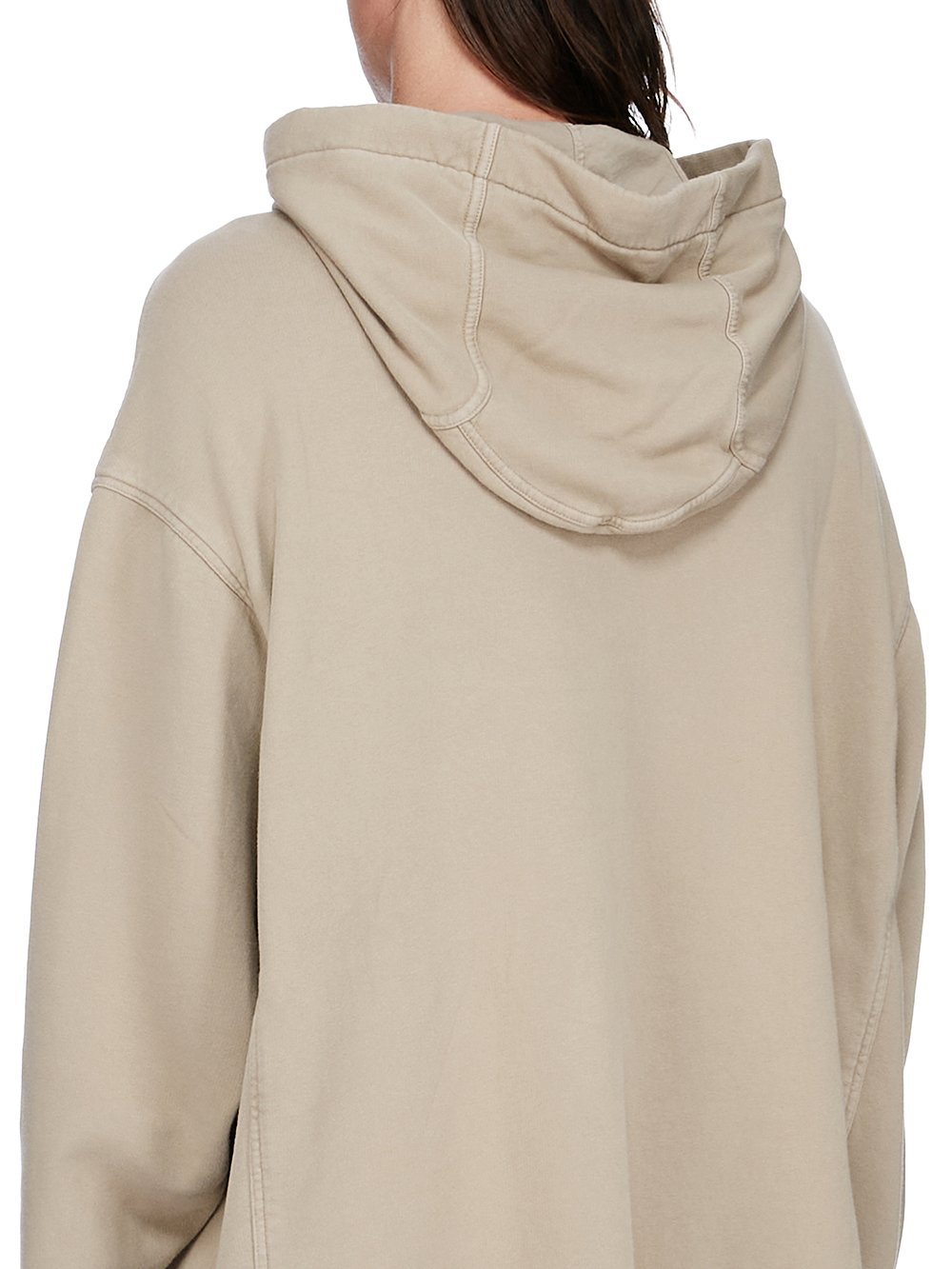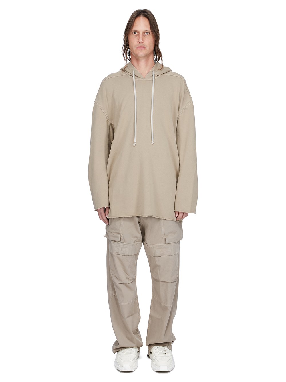 THIS PETER HOODIE IS HIP LENGTH, DIPPING SLIGHTLY AT THE BACK, WITH AN OVERSIZE FIT. IT HAS LONG SLEEVES WITH LOW SHOULDERS, A DROPPED ARMHOLE, A HOOD WITH DRAWSTRING AND RAW CUT HEMS. IT FEATURES A YOKE AND DIAGONAL SEAMS WITH TOPSTITCHING ON THE FRONT AND BACK BODY.