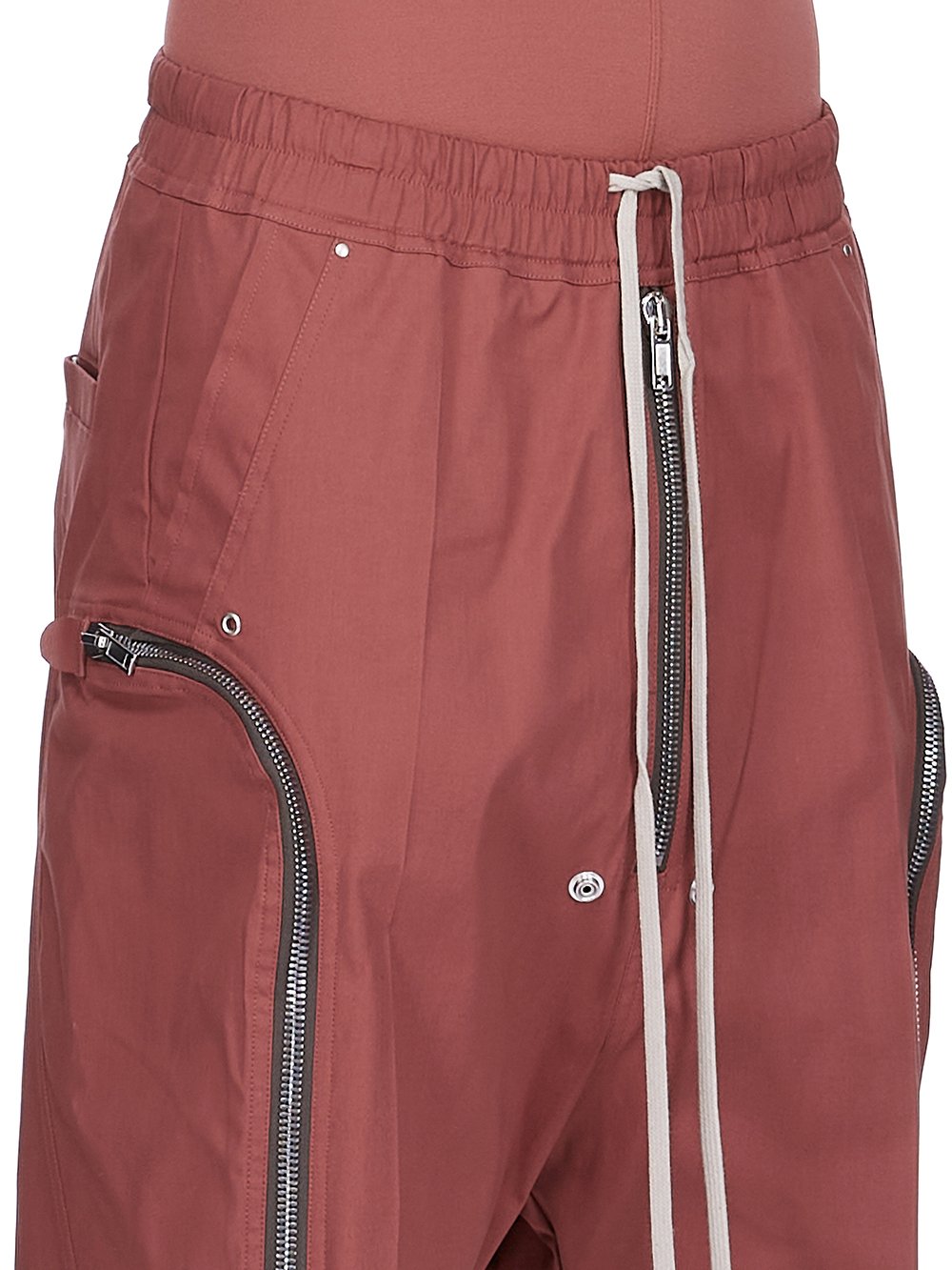 THESE BAUHAUS BELAS ARE KNEE LENGTH AND FEATURE AN ELASTICIZED WAISTBAND WITH DRAWSTRING. THEY HAVE A BELA EXPOSED CENTRE ZIPPER WITH TWO SNAP DETAIL AT BOTTOM, AND A LOW CROTCH. THEY FEATURE SIDE WELT POCKETS WITH EYELET AND RIVET DETAIL, BAUHAUS ZIPPERED POCKETS WITH LARGE EYELETS, AND BACK POCKETS WITH FLAP AND SNAP CLOSURES.