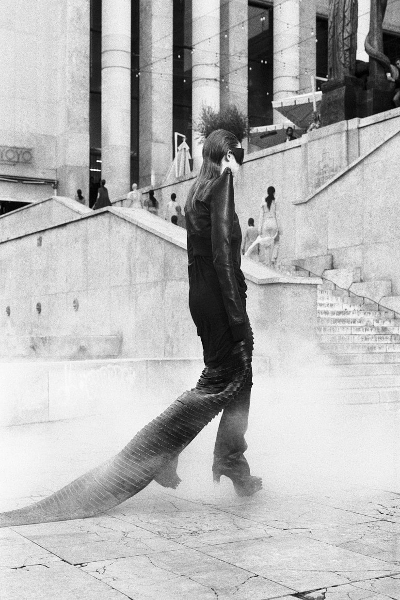 THERE’S SOMETHING ALIEN ABOUT IT THAT IS PLEASING – I’VE REALLY BEEN ENJOYING THE NEW PUNK AESTHETIC THAT SALVIA AND FECAL MATTER ARE DEVELOPING. IT’S ONE OF THE FIRST AESTHETIC MOVEMENTS THAT I’VE SEEN FOR A LONG TIME – STYLE WISE – THAT HAS EXCITED ME. WHAT COMES AFTER PUNK, NEW WAVE, GOTH, ETC? MUTANT! AND THAT’S WHAT THOSE ARTISTS WERE DOING. THE TEC SHOULDER IS SORT OF A BRIDGE THAT CONNECTS OUR ORIGINAL JACKET TO THE MUTANT AESTHETIC, IN AN ART DECO SHAPE. THAT KIND OF FIGURE WITH A LONG BIAS GOWN THAT CREATES A SINEWOUS LINE THAT LENGTHENS YOU. IT’S AUBREY BEARDSLEY. –RICK OWENS