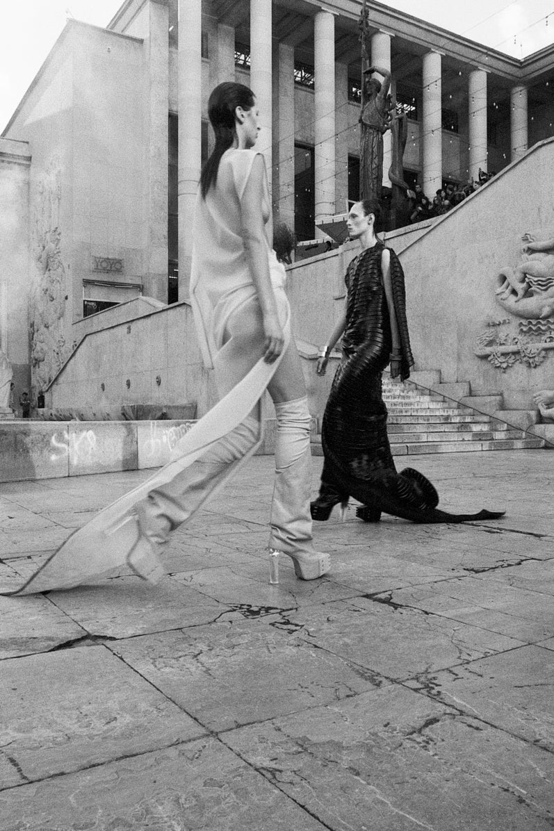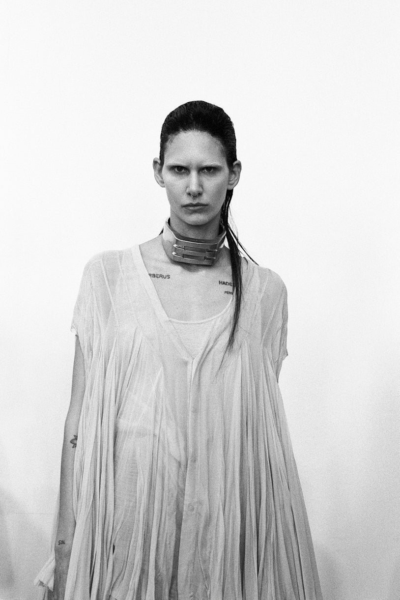 WHEN I LOOK AT THIS COLLECTION I SEE A SLITHERING, FEMME-FATALE, THEDA BARA LOOK TO IT. LIKE A BLEACHED VERSION OF THOSE BLACK AND WHITE MOVIES OF 1920S EGYPTIAN CAMP WITH A KIND OF PAUL POIRET EXOTICISM. –RICK OWENS