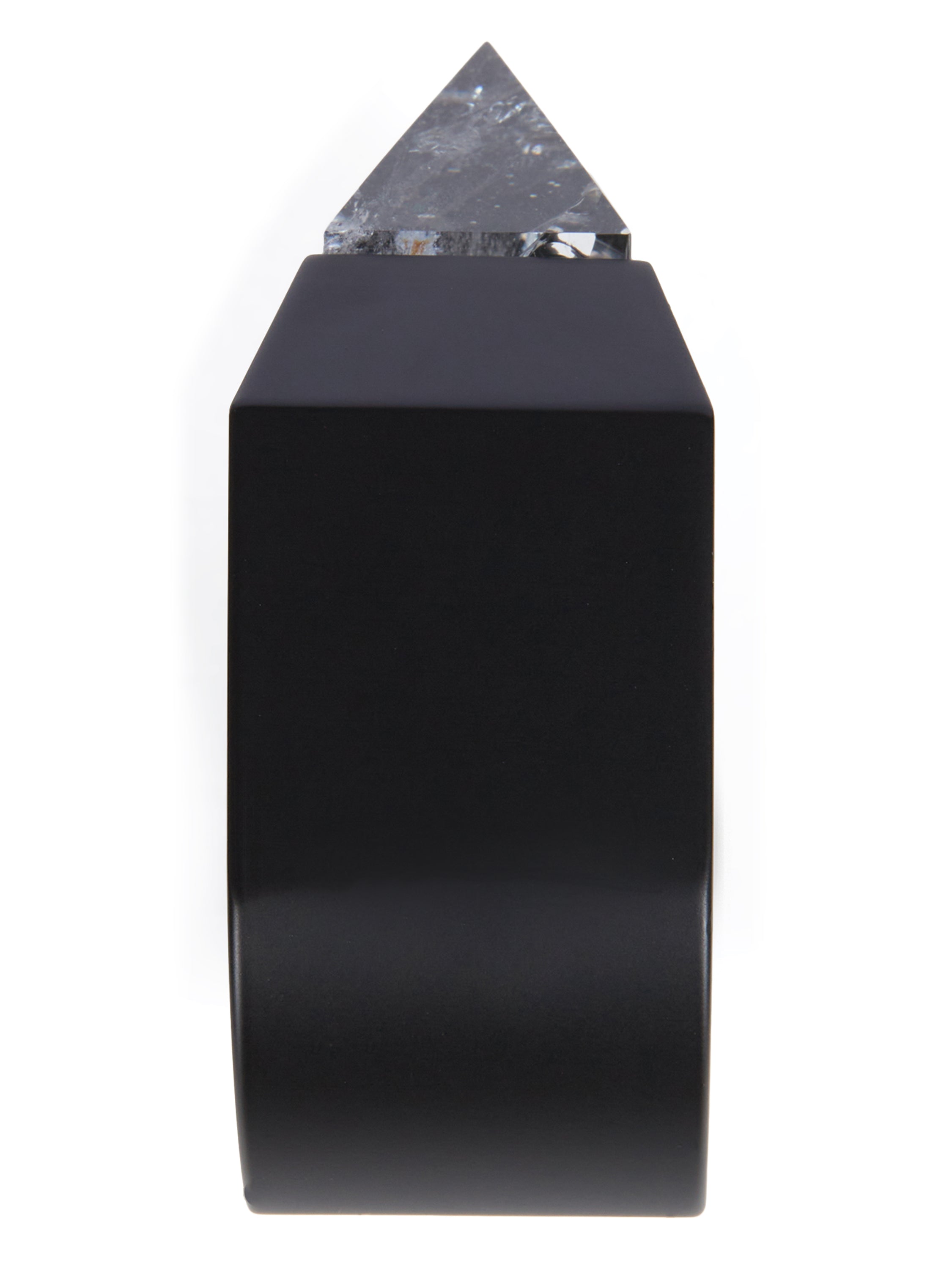 THIS CRYSTAL PYRAMID BRACELET IS A LARGE RIGID METAL CUFF WITH BEVELED EDGES. IT IS ORNAMENTED WITH A LARGE PYRAMID SHAPED ROCK CRYSTAL. IT HAS THE RICK OWENS LOGO ENGRAVED IN THE SIDE FACE.