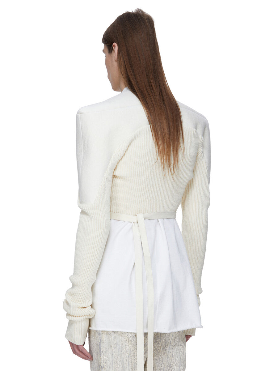 THIS TIGHT JKT IS WAIST LENGTH. IT IS CLOSE-FITTING, WITH LONG, RIB KNIT SLEEVES, AND AN OPEN FRONT THAT SECURES WITH A LONG TIE THAT THEN WRAPS AROUND THE WAIST. IT FEATURES STRUCTURED, WIDE TATLIN SHOULDERS WITH A GIRDERED SHOULDER SEAM, AND YOKE THAT IS HORIZONTAL ACROSS THE CHEST AND DESCENDS DOWN THE ARM, TO FINISH IN A BLUNT POINT AT THE ELBOW.