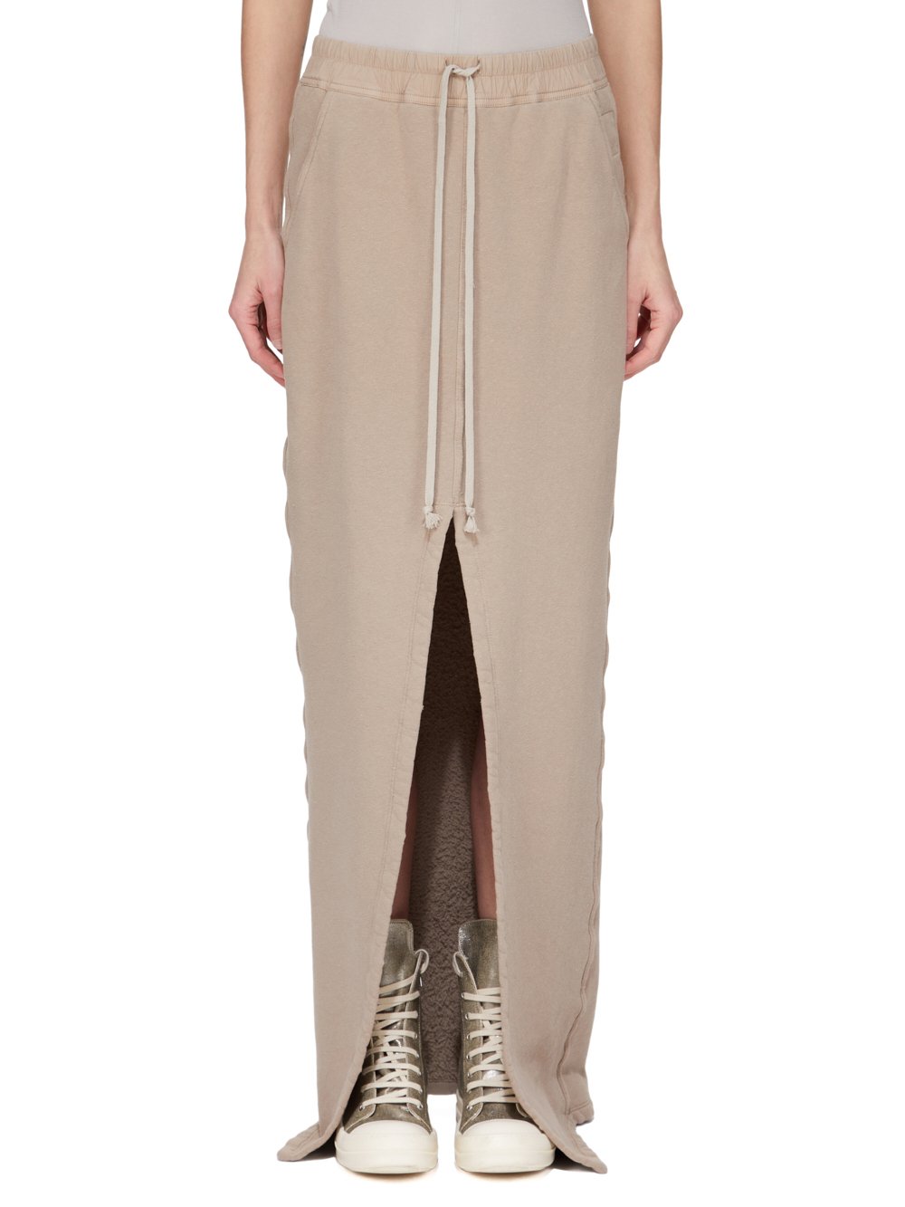 THIS PHLEG PILLAR SKIRT TRAILS FLOOR LENGTH AT BACK AND SIDES AND HAS A FRONT SLIT TO ABOVE KNEE HEIGHT. IT HAS AN ELASTICIZED WAISTBAND WITH DRAWSTRING AND TWO SIDE FRONT POCKETS.