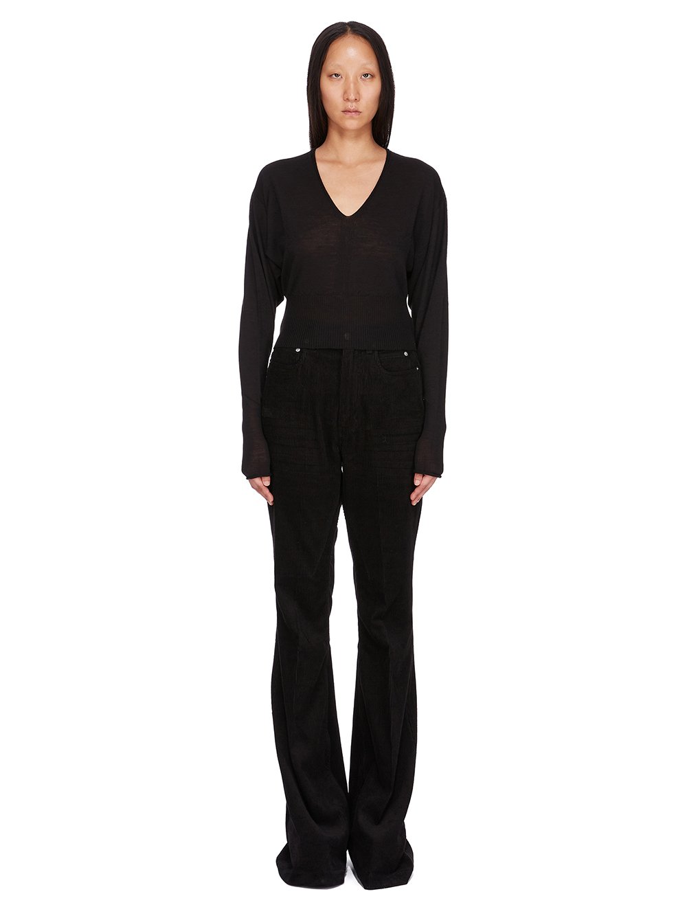 THIS V CROPPED TOP IS WAIST LENGTH WITH A WIDE RIBBED WAISTBAND. IT HAS LONG, WIDE BATWING-LIKE, SLEEVES AND A DEEP V NECK WITH SLIM KNIT EDGE AND FRONT LINE DETAIL. IT FEATURES A SIGNATURE KNIT LINE RUNNING DOWN THE CENTRE BACK SPINE.