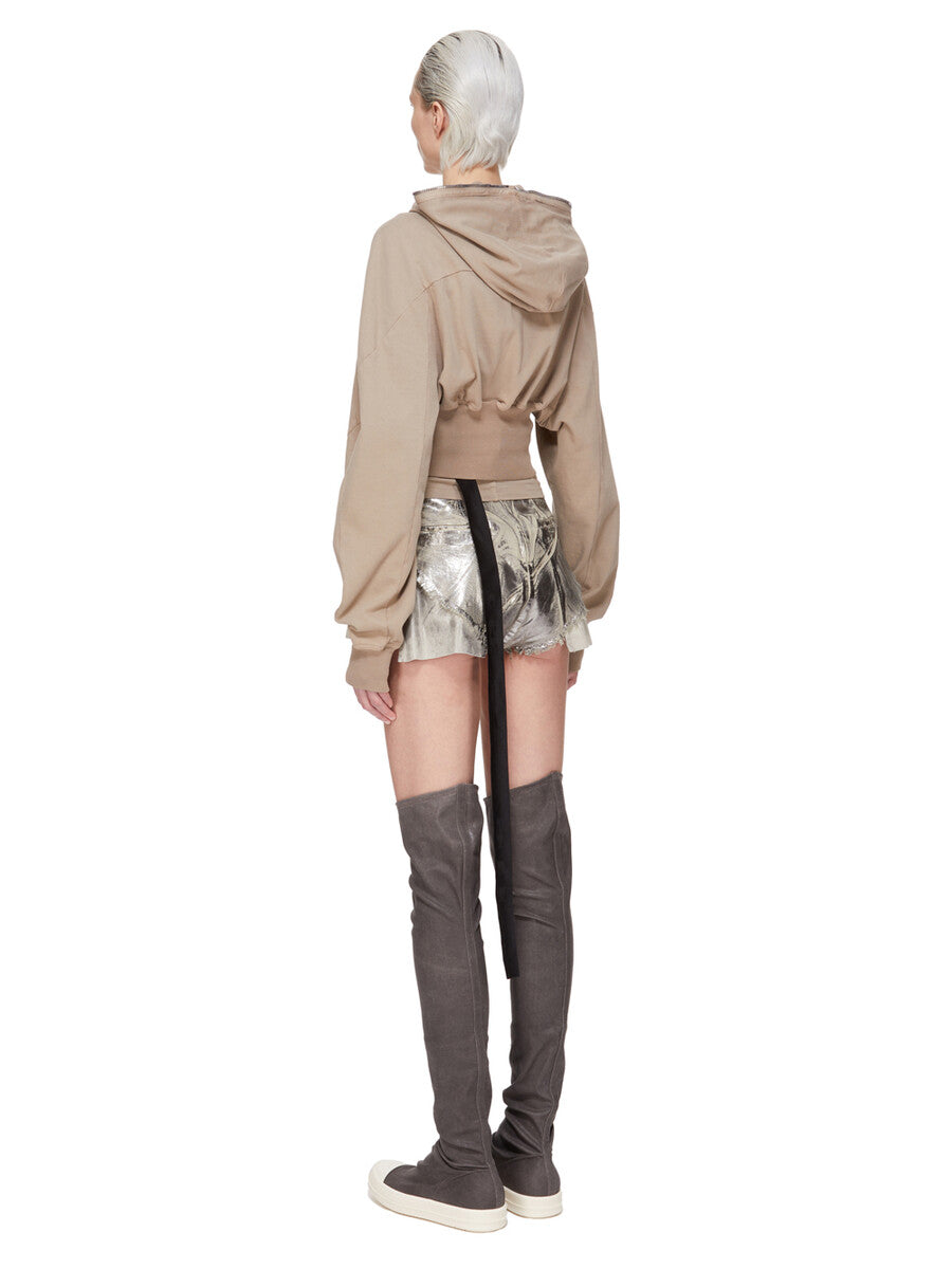 THIS COLLAGE GIMP HOODIE IS CROPPED WAIST LENGTH AND HAS LONG SLEEVES. IT HAS A FRONT ZIPPER CLOSURE WITH EXPOSED ZIPPER TAPE THAT RUNS FROM THE HEM ALL THE WAY UP THROUGH THE HOOD, ALLOWING IT TO BE ZIPPERED COMPLETELY CLOSED OVER THE FACE. IT FEATURES GEOMETRIC GIRDERED SHOULDERS AND STITCHING, A FRONT AND BACK YOKE AND HAS RIBBED CUFFS AND WIDE WAISTBAND.