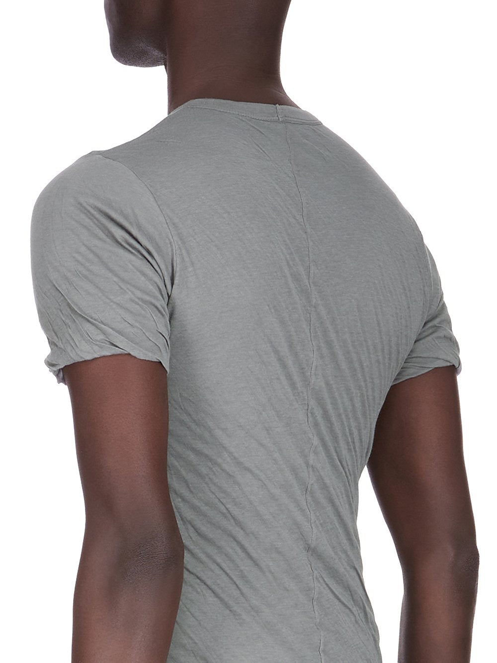 THIS DOUBLE SS T IS BELOW HIP LENGTH AND HAS SHORT SLEEVES AND A RIBBED ROUND NECK. IT FEATURES A DOUBLE LAYER OF FABRIC, WITH THE HEM AND SLEEVES ON THE FOLD, CREATING A SLIGHT DRAPED EFFECT, AND THE SIGNATURE SINGLE SEAM RUNNING DOWN THE CENTRE BACK SPINE.