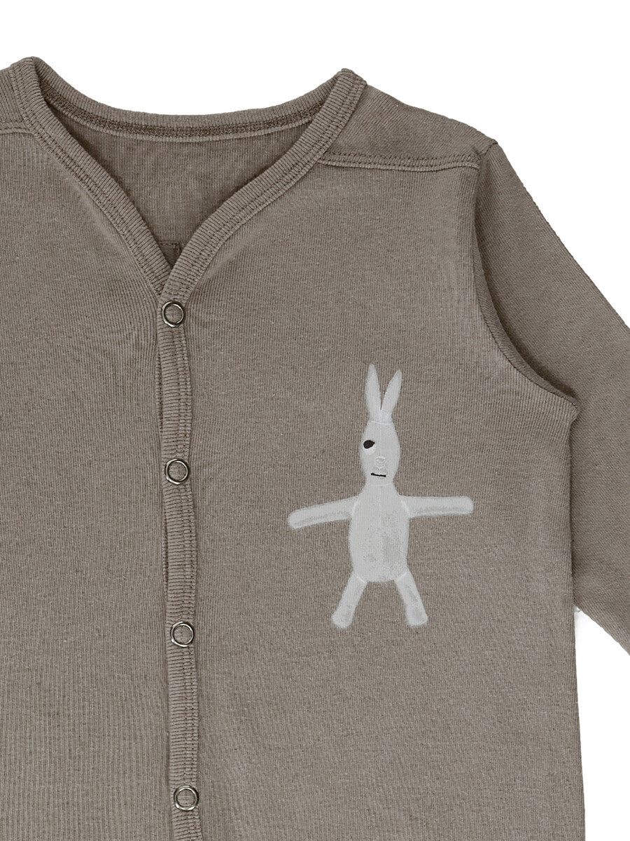 THIS BODY LONG HAS LONG SLEEVES AND LEGS WITH RIBBED WRISTS AND ANKLES. IT HAS A SLIGHT V NECK WITH SNAPS ALL ROUND.