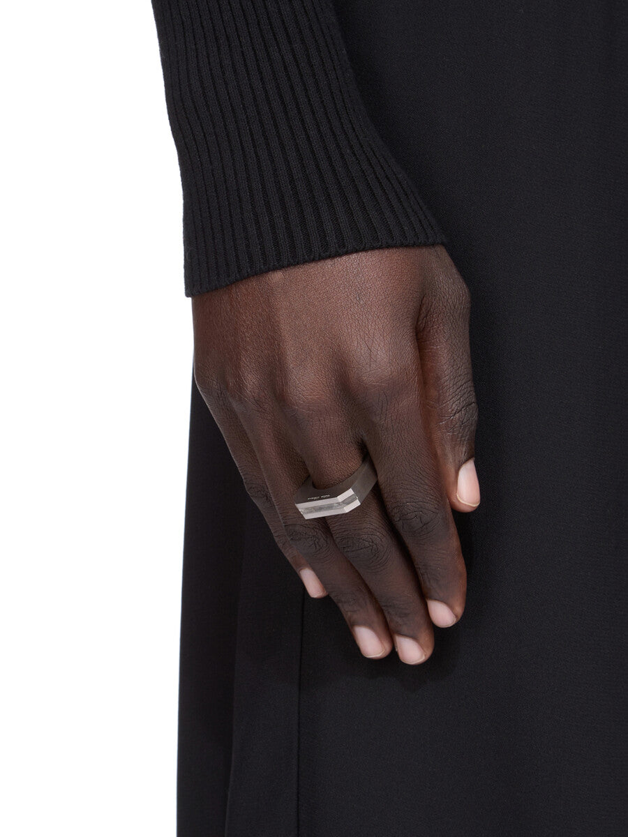 THIS BEVELED RING IS A THICK BAND WITH BEVELED EDGES. IT HAS THE RICK OWENS LOGO ENGRAVED ON THE BACK.