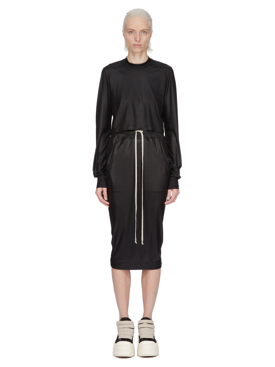 DRKSHDW SS26 TEMPLE PULL ON PILLAR SKIRT KNEE IN BLACK LIQUID JERSEY
