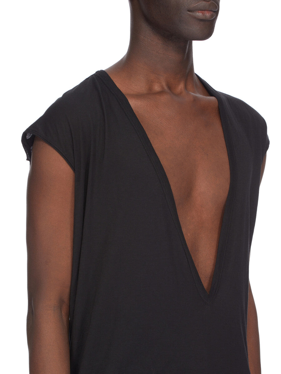 THIS DYLAN T IS BELOW HIP LENGTH, IT HAS AN EXTREME DEEP V NECK WITH WIDE TANK SHOULDERS WITH REINFORCED RAW CUT ARMHOLES. IT FEATURES THE SIGNATURE SINGLE SEAM RUNNING DOWN THE CENTRE BACK SPINE.