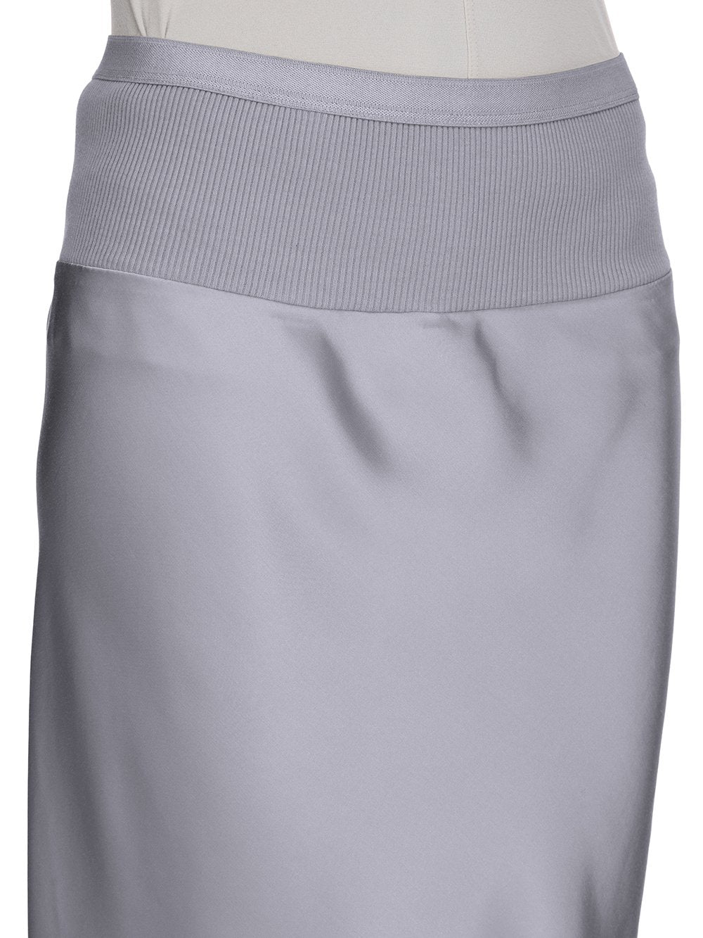 THIS SHORT BIAS SKIRT IS ABOVE KNEE LENGTH, WITH A WIDE RIBBING AND ELASTICIZED WAISTBAND. IT FEATURES A DIAGONAL BIAS CUT SEAM WITH DRAPED INSERT AT MID BACK.