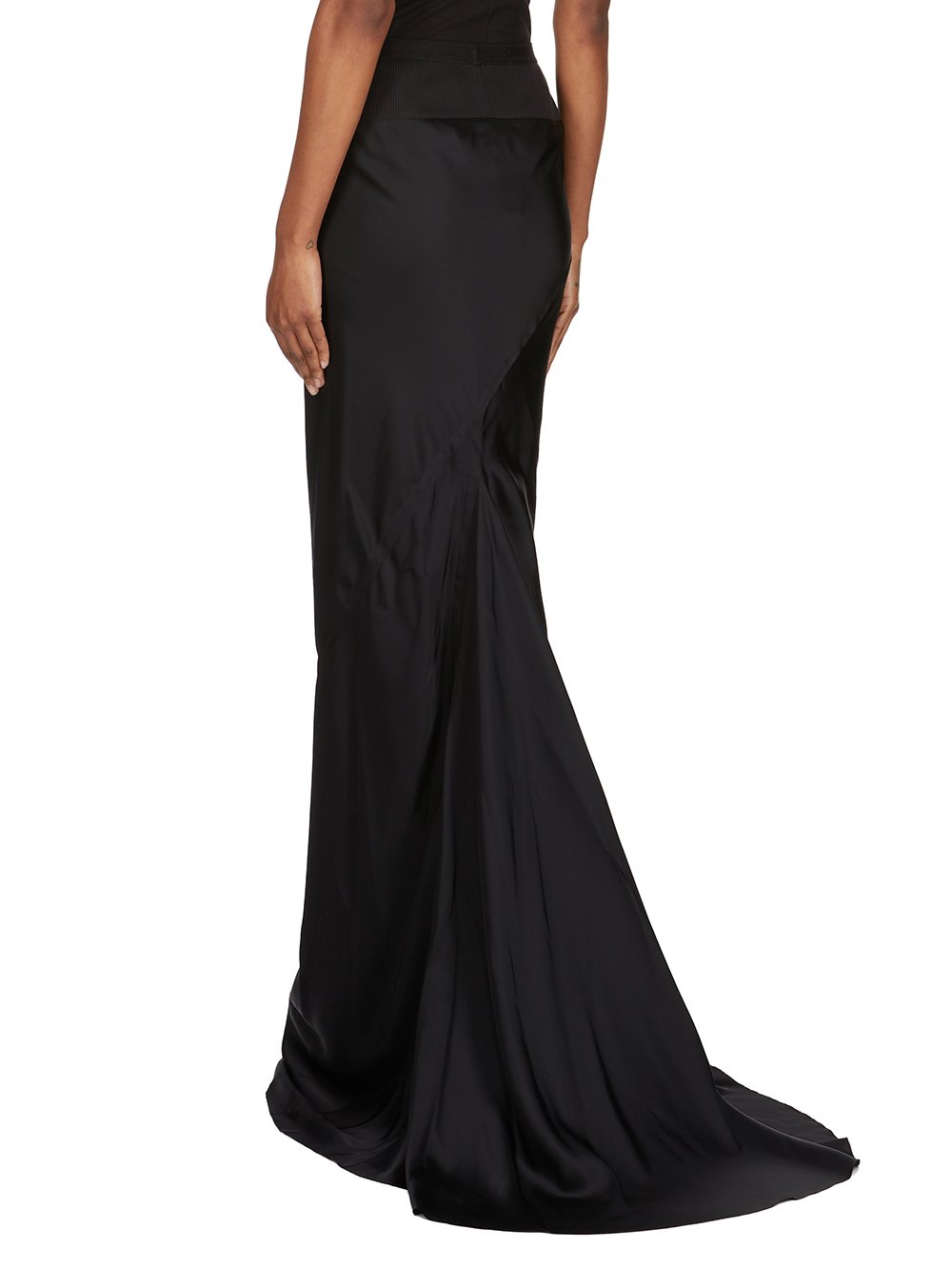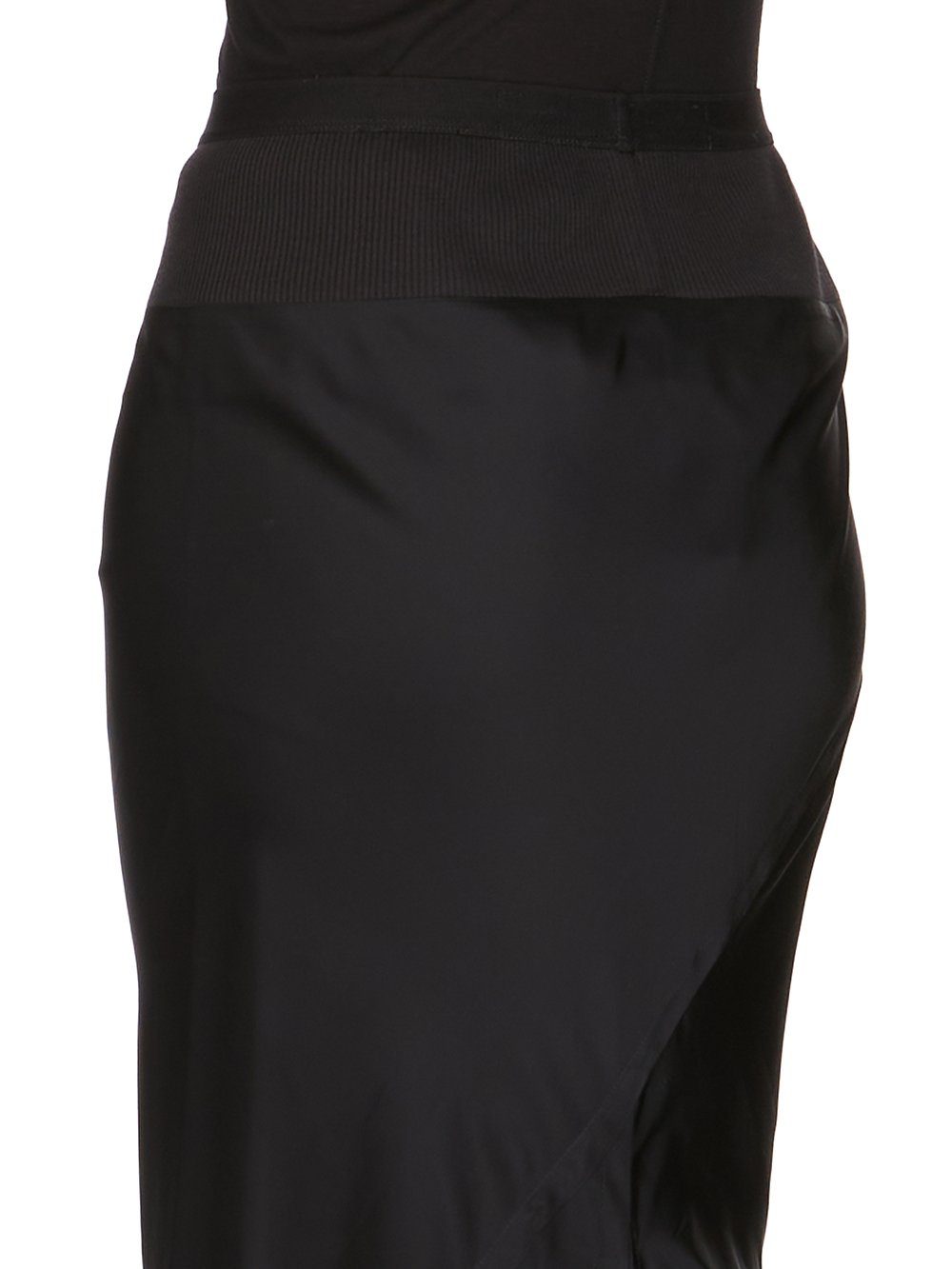 THIS SLIM LONG CODA SKIRT IS FLOOR LENGTH WITH A WIDE RIBBING AND ELASTICIZED WAISTBAND. IT FALLS IN A SLIM COLUMN TO THE FLOOR AND FEATURES A DIAGONAL BIAS CUT SEAM WITH DRAPED INSERT AT MID BACK.