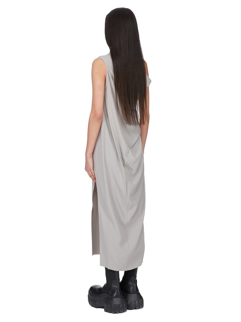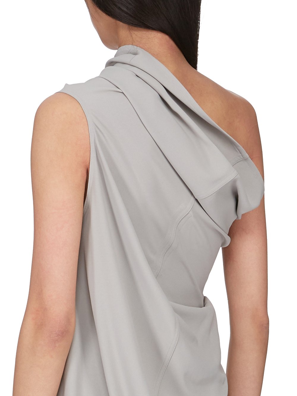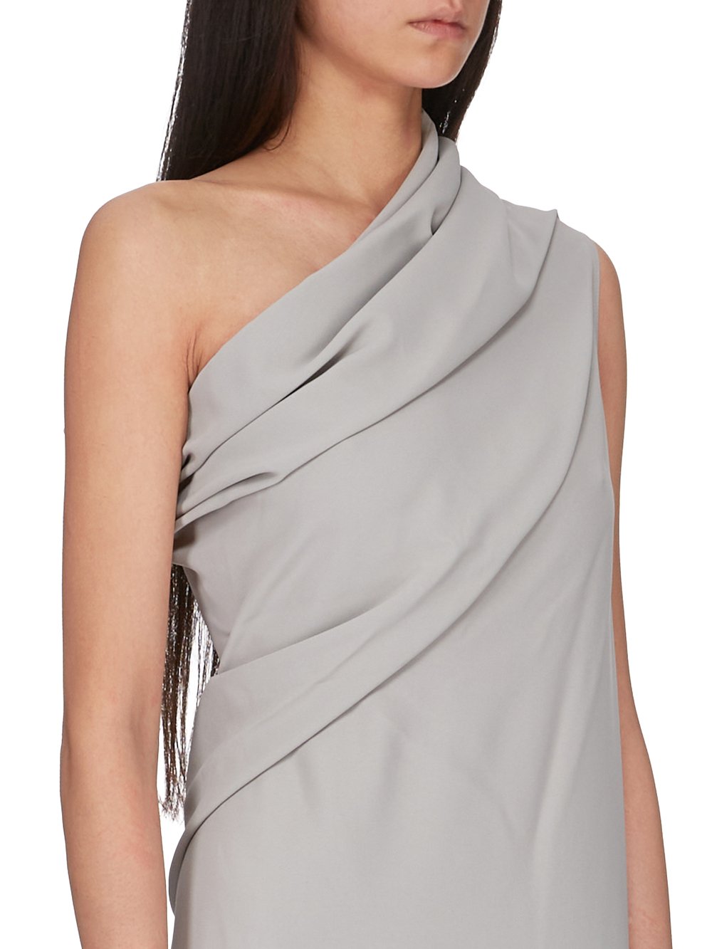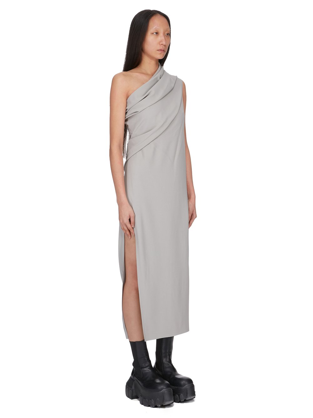 THIS ATHENA ARROWHEAD IS MID THIGH LENGTH. IT HAS ONE RIGHT SHOULDER WITH AN ASYMMETRICAL NECKLINE THAT DRAPES ACROSS THE BODY. IT FEATURES A SKIRT WITH TWO HIGH SIDE SLITS WHICH TAPERS SLIGHTLY TO THE FLOOR WITH A CENTRE BACK SEAM.