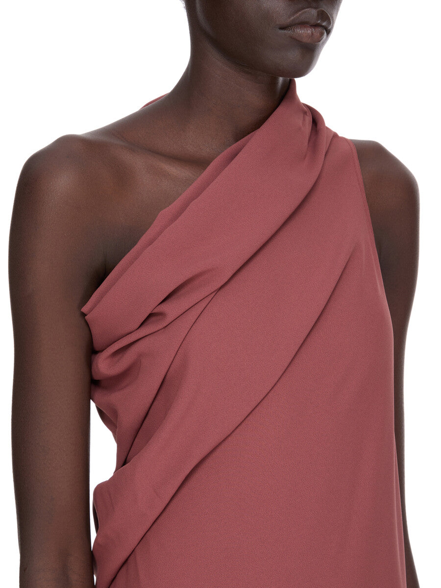THIS ATHENA ARROWHEAD IS MID THIGH LENGTH. IT HAS ONE RIGHT SHOULDER WITH AN ASYMMETRICAL NECKLINE THAT DRAPES ACROSS THE BODY. IT FEATURES A SKIRT WITH TWO HIGH SIDE SLITS WHICH TAPERS SLIGHTLY TO THE FLOOR WITH A CENTRE BACK SEAM.