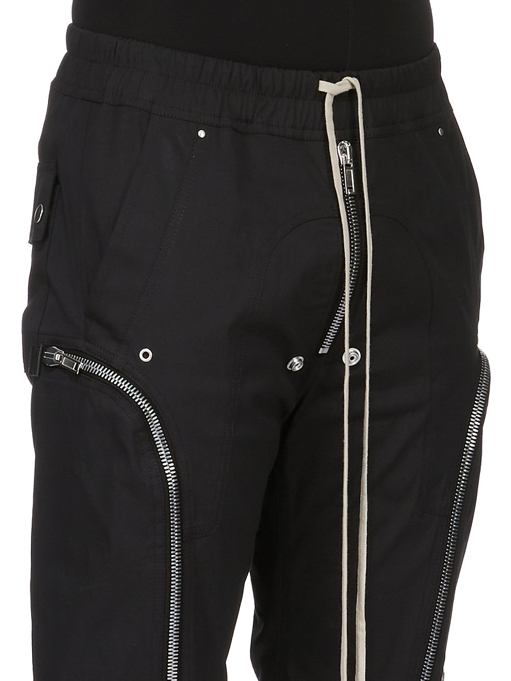 THESE BAUHAUS CARGO PANTS ARE FULL LENGTH WITH A SLIM FIT. THEY HAVE AN ELASTICIZED WAISTBAND WITH DRAWSTRING, A BELA EXPOSED CENTRE ZIPPER WITH SNAP DETAIL AT BOTTOM, ROUNDED BAUHAUS ZIPPERED POCKETS ON BOTH THIGHS WITH EYELETS, FRONT SHIN SPLITS WITH ZIPPERS AND ELASTICATED CUFFS. THEY HAVE SIDE FRONT WELT POCKETS WITH RIVET DETAIL, SQUARE BACK POCKETS WITH FLAPS AND SNAPS, AND FRONT YOKES AND SEAMS WITH DOUBLE TOP STITCHING.