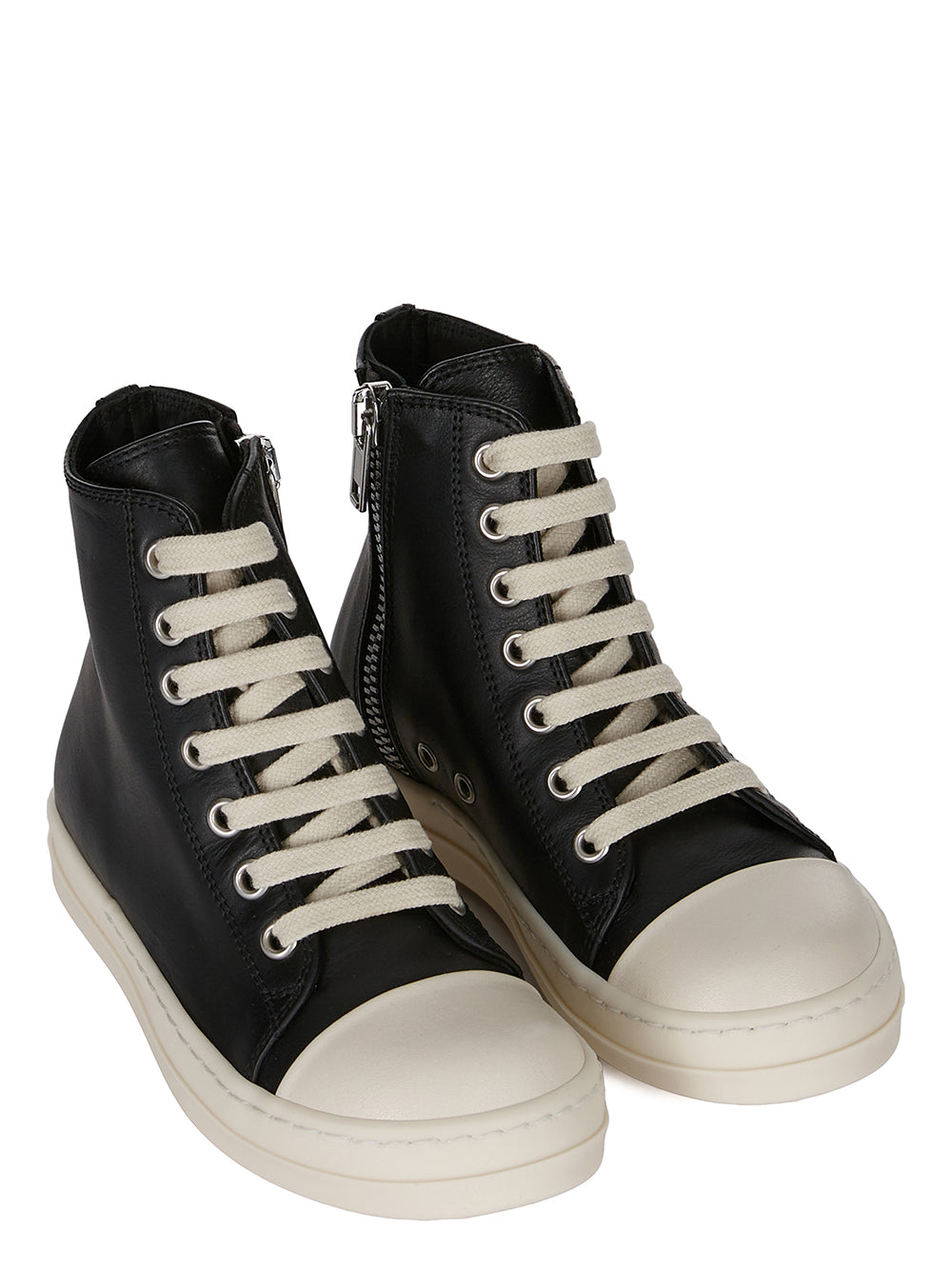 THESE KIDS SNEAKS ARE ABOVE-ANKLE HEIGHT WITH LACES, A SIDE ZIPPER FOR EASY FASTENING, SIDE VENTS AND VISIBLE STITCHING, MILK TOE CAPS AND SHARK-TOOTH SOLES.