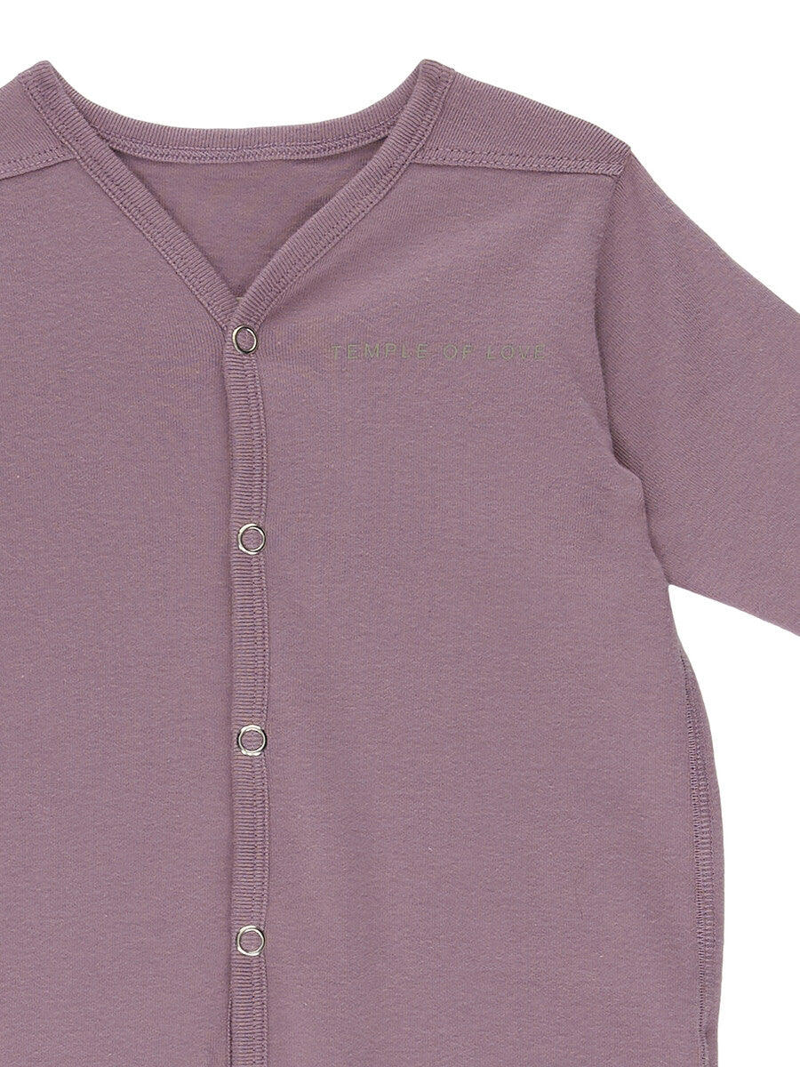 THIS BODY LONG HAS LONG SLEEVES AND LEGS WITH RIBBED WRISTS AND ANKLES. IT HAS A SLIGHT V NECK WITH SNAPS FROM NECK DOWN TO LEFT ANKLE. IT FEATURES "TEMPLE OF LOVE" ON LEFT FRONT.