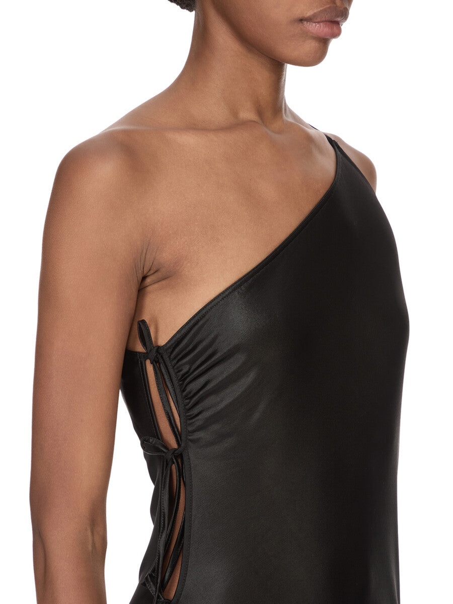THIS TACO DRESS TRAILS FLOOR LENGTH AT BACK AND HAS AN ASYMMETRICAL NECKLINE WITH ONE THIN SHOULDER STRAP. IT FEATURES AN OPEN RIGHT SIDE BODY THAT SECURES WITH TIES ALL THE WAY DOWN TO THE HIP, REVEALING THE SIDE BODY AND LEG. ITS SKIRT TAPERS TO THE FLOOR.