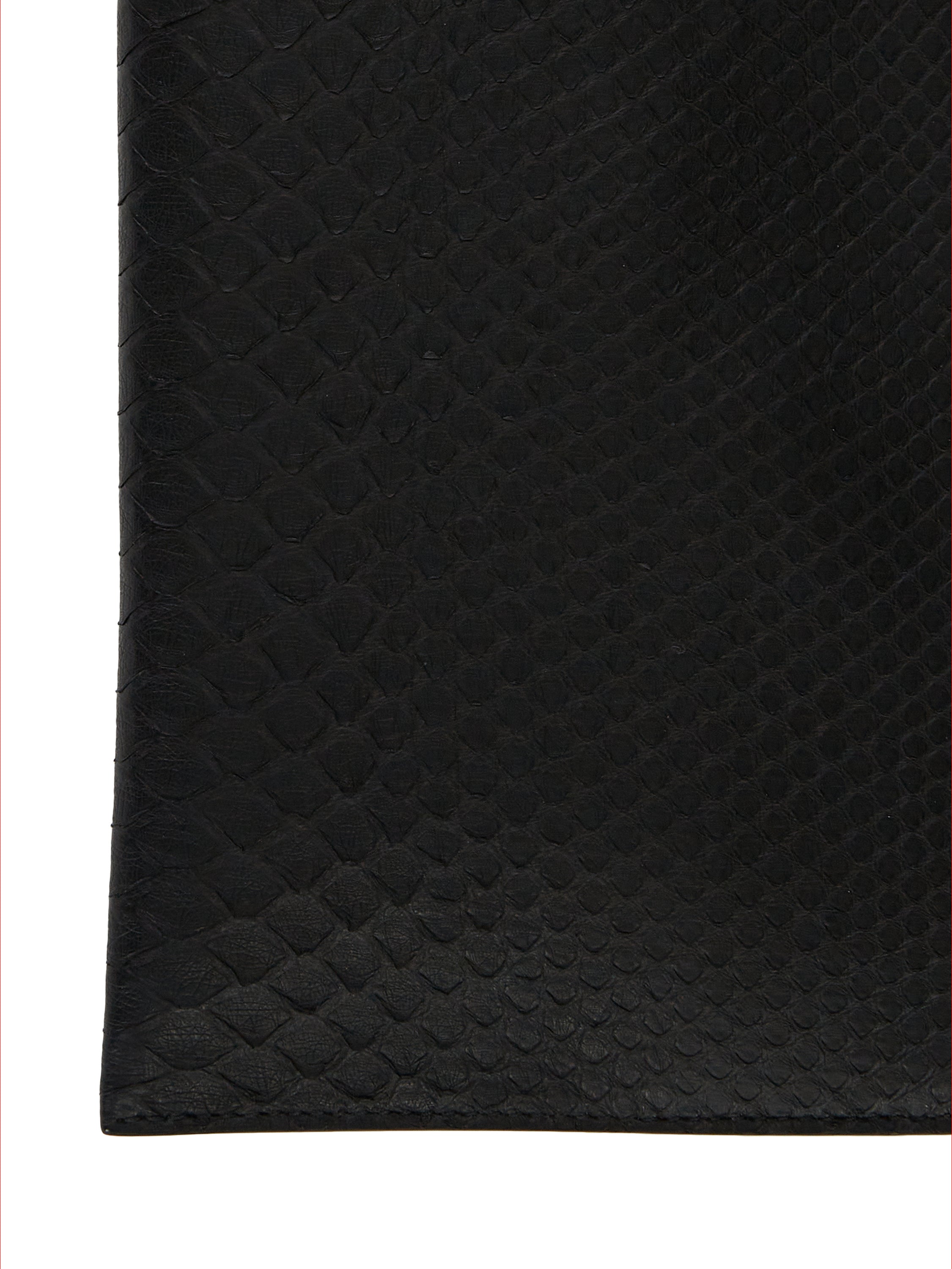THIS GENUINE PYTHON SNAKESKIN HAS A WAXY AND SOFT HAND FEEL. IT IS COLORED IN A DIAMOND PATTERN FOLLOWING THE NATURAL SCALES OF THE PYTHON. EACH STEP OF THE COLORING PROCESS IS EXECUTED BY HAND.