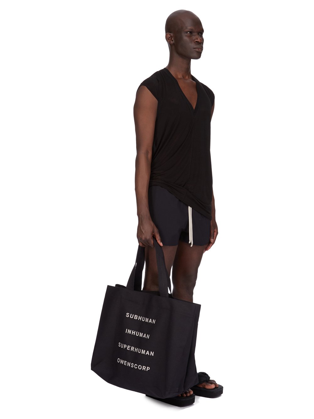 THIS BEACH BAG IS A LARGE RECTANGULAR TOTE WITH AN OPEN TOP. IT HAS TWO CARRY HANDLES THAT FIT OVER THE SHOULDER, TWO INTERNAL HAND CARRY STRAPS, AND AN INTERNAL POCKET. IT FEATURES THE RICK OWENS PENTAGRAM MOTIVO ON FRONT.
