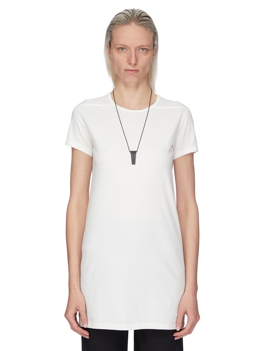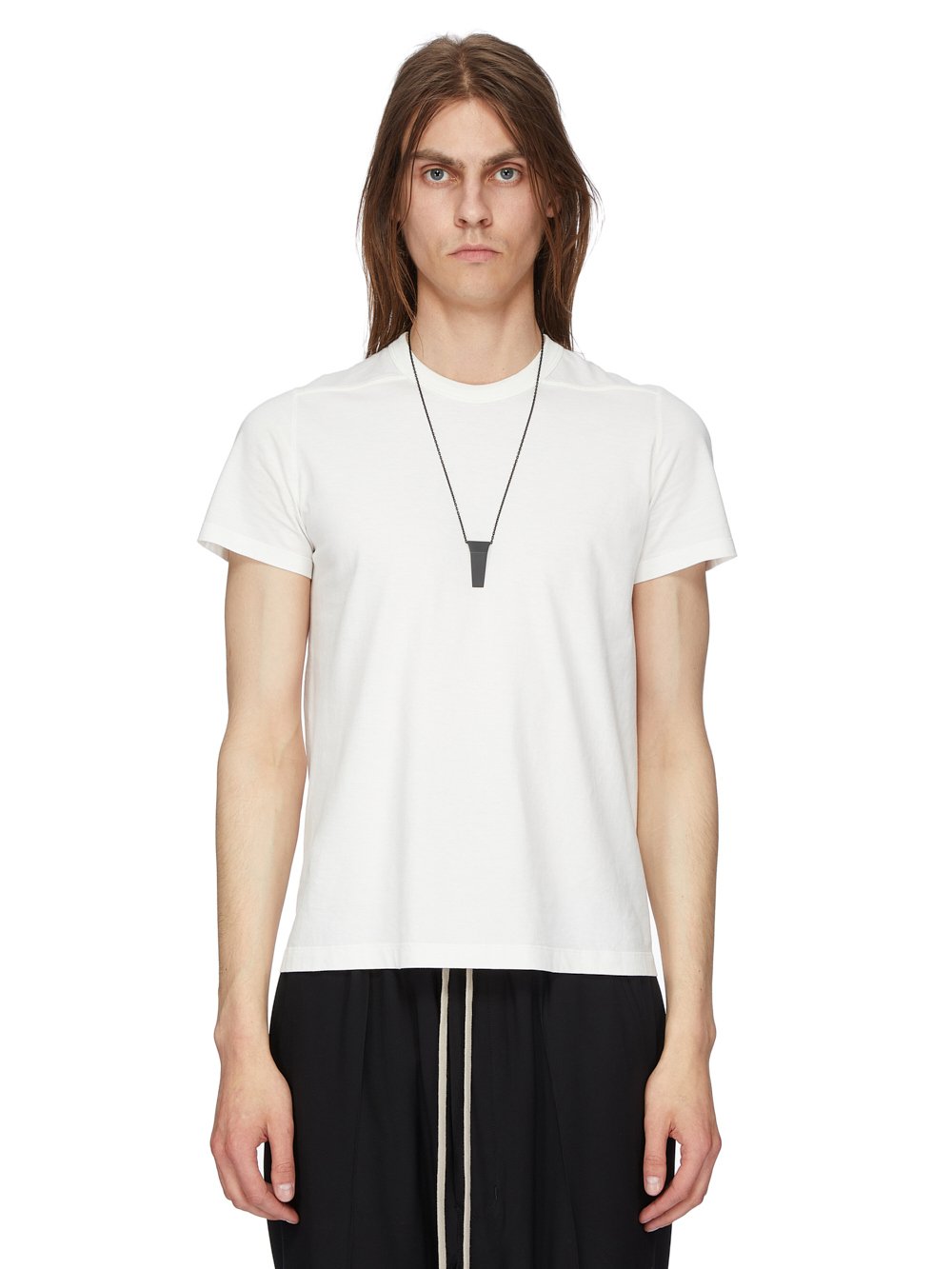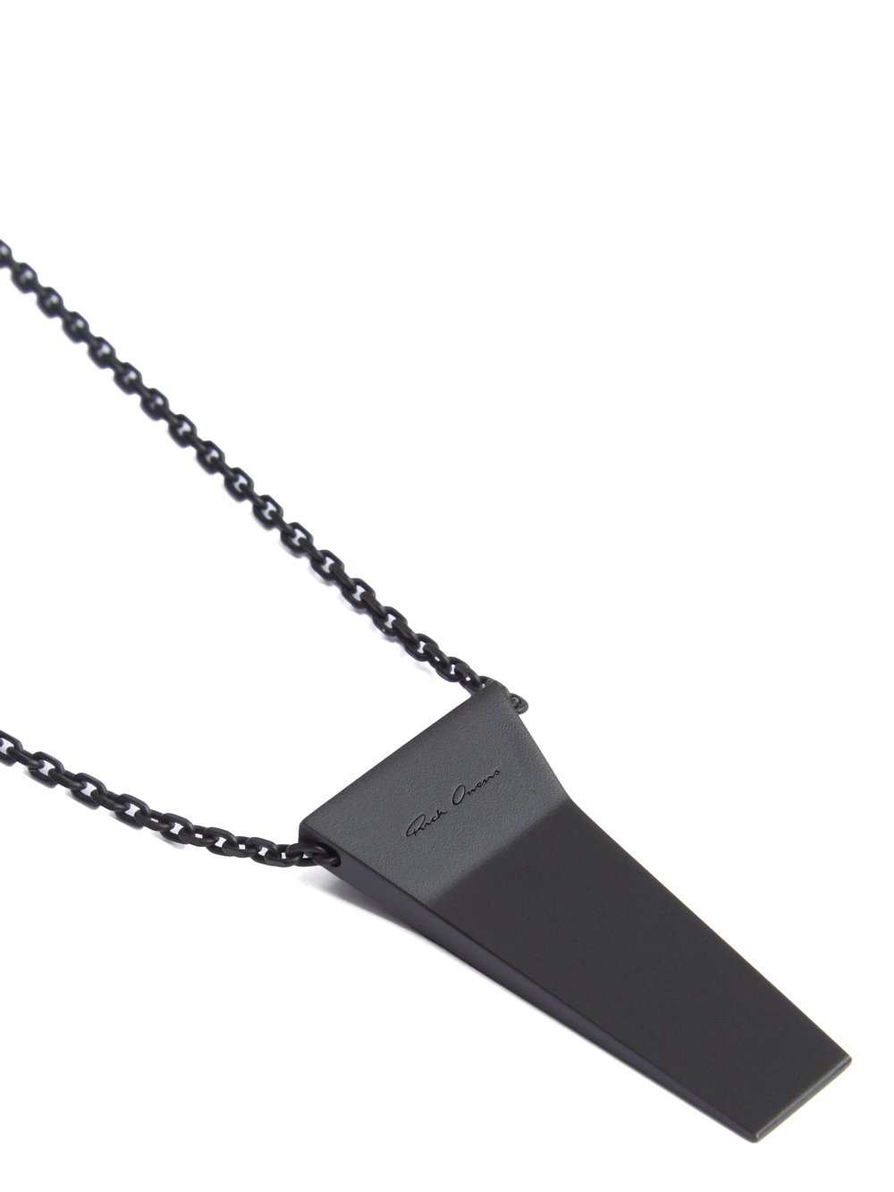 THIS TRUNK CHARM NECKLACE HAS A SMALL GEOMETRIC TRUNK SHAPED CHARM WITH BEVELED EDGES HANGING FROM A CHAIN NECKLACE. IT HAS THE RICK OWENS LOGO ENGRAVED ON THE BACK.