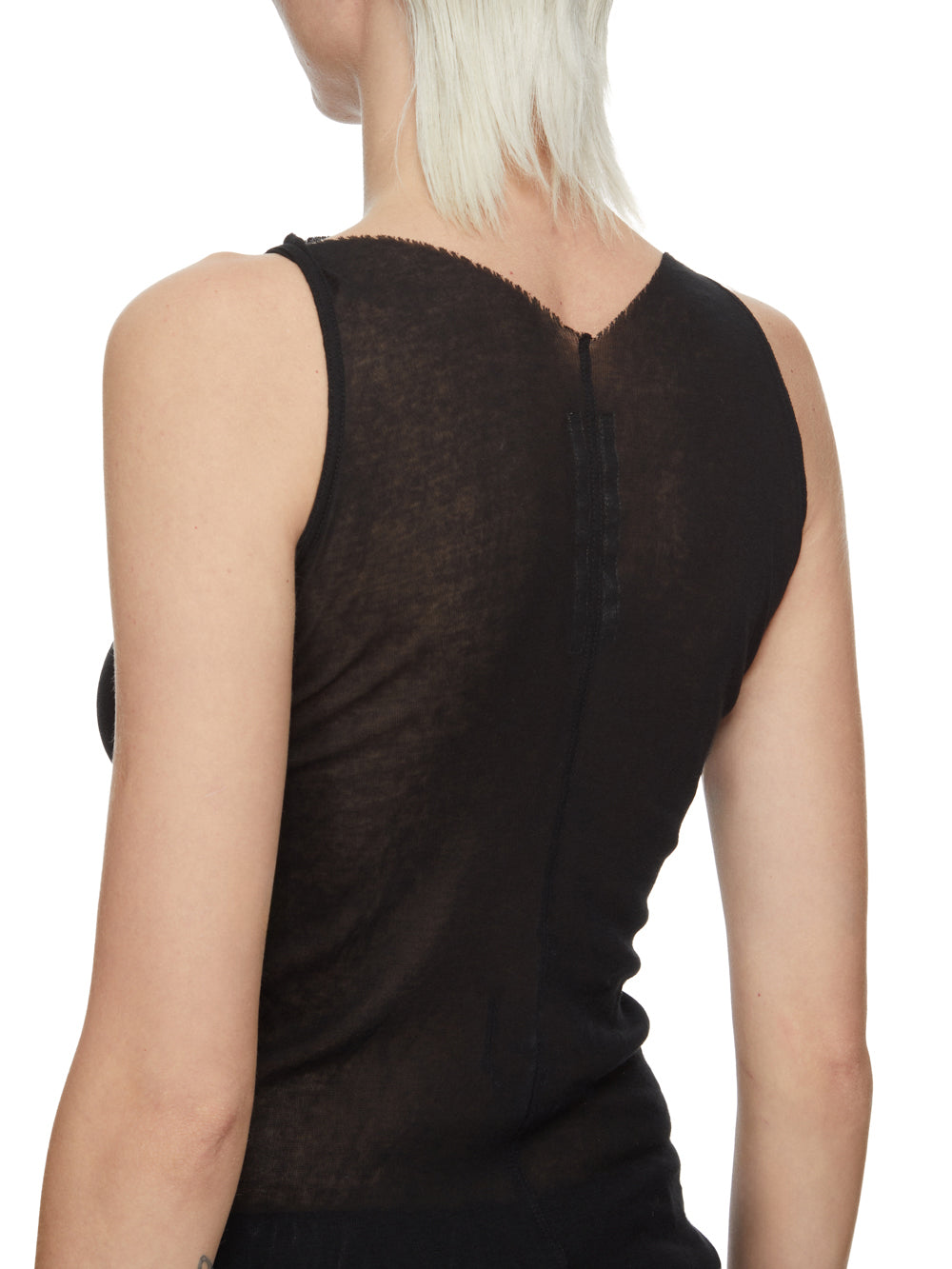 THIS SL TOP IS HIP LENGTH AND SLEEVELESS. IT FEATURES A STRAIGHT FRONT NECK THAT SCOOPS LOWER AT THE BACK. IT HAS GEOMETRIC SEAM LINES ACROSS THE FRONT AND A SINGLE SEAM DOWN THE CENTRE BACK. THIS VERSION IS TRANSPARENT AND CAN BE WORN LAYERED WITH OTHER GARMENTS IN THE TULLE SECTION OF THIS COLLECTION.