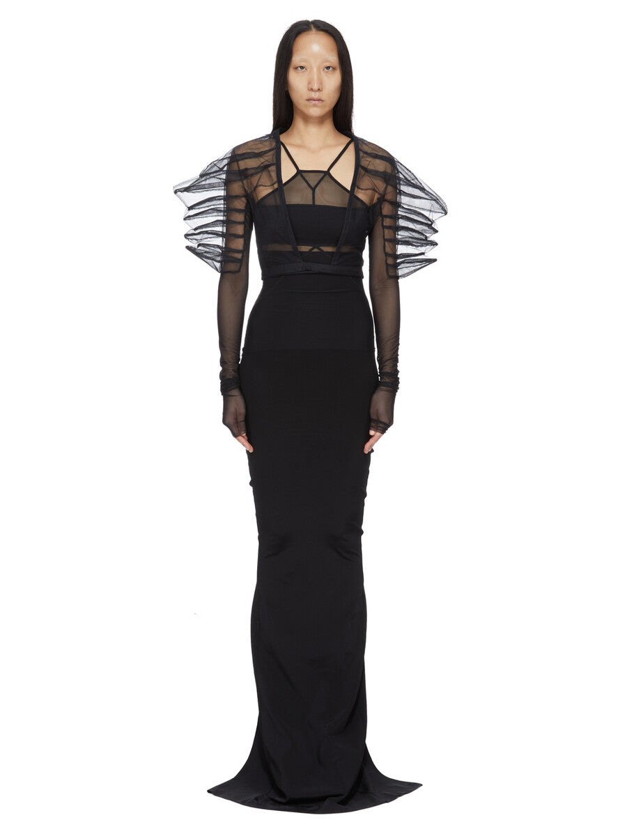 RICK OWENS SS26 TEMPLE RHINO TOP IN BLACK RECYCLED TULLE AND STRETCH TULLE